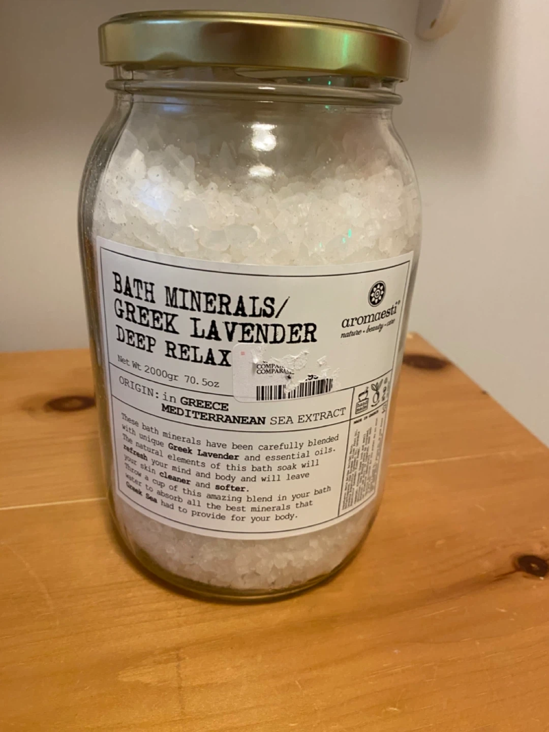 Bath minerals carefully blended with Greek Lavender and essential oils. It'll refresh your mind and body, leaving skin cleaner and softer. Throw a cup in bath water to absorb minerals from Greek Sea. 2000 gr