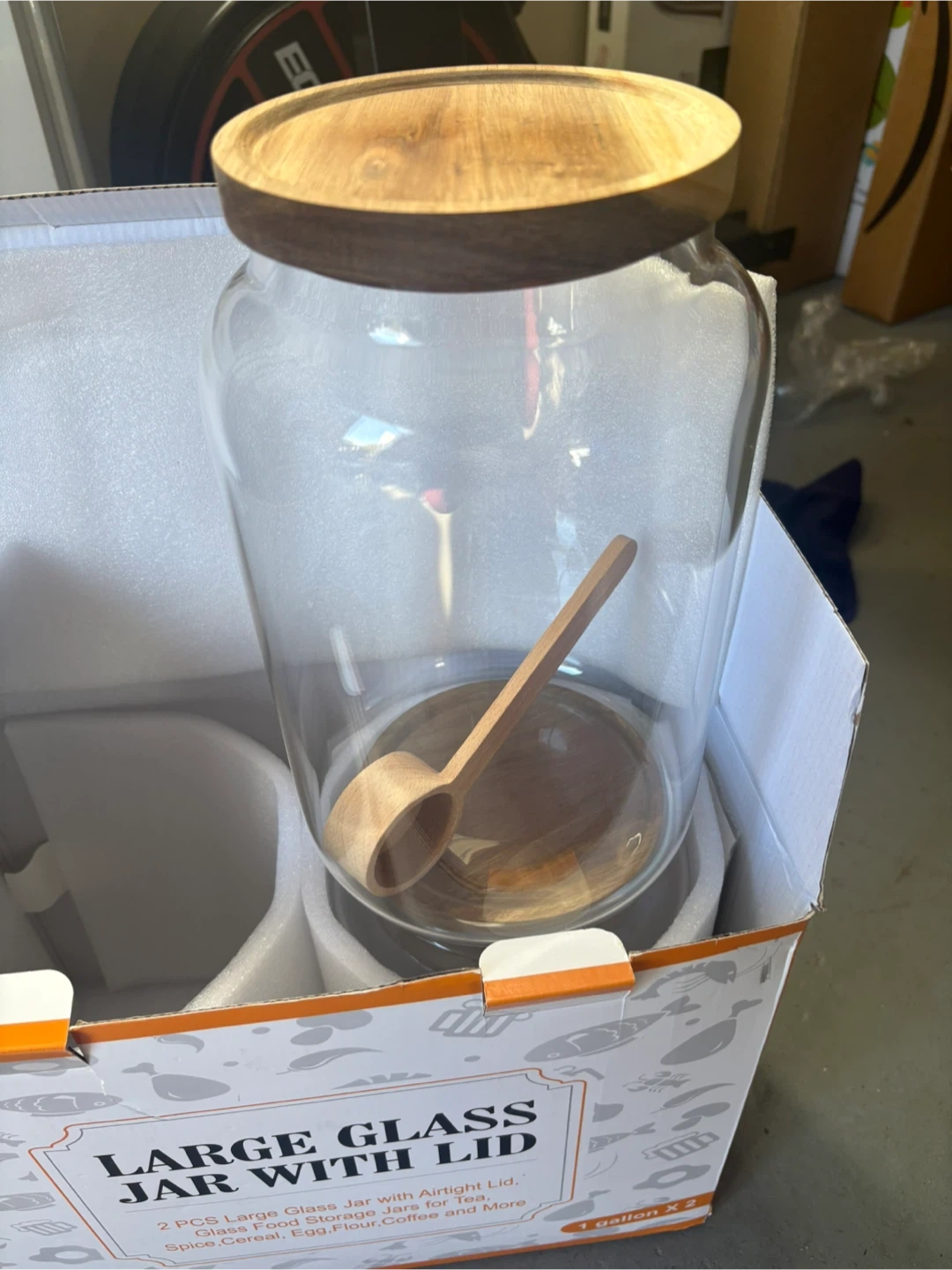 Set of two large glass jars, each holding 1 gallon. They come with natural acacia wood lids for an airtight seal and include wooden spoons. Great for storing dry goods like flour, cereal, or coffee.