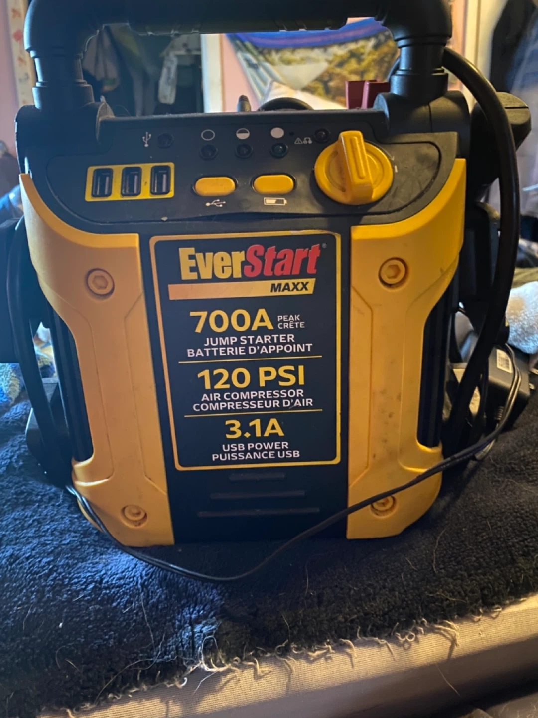 This EverStart MAXX jump starter offers 700 peak amps for starting batteries. It also includes a 120 PSI air compressor for inflating tires. Features 3.1A USB power for charging devices. Useful for roadside assistance and car maintenance.