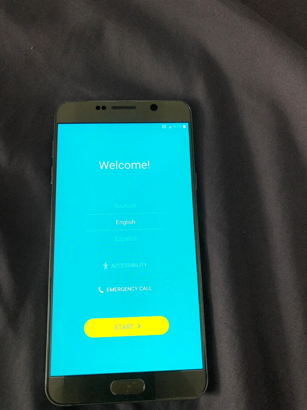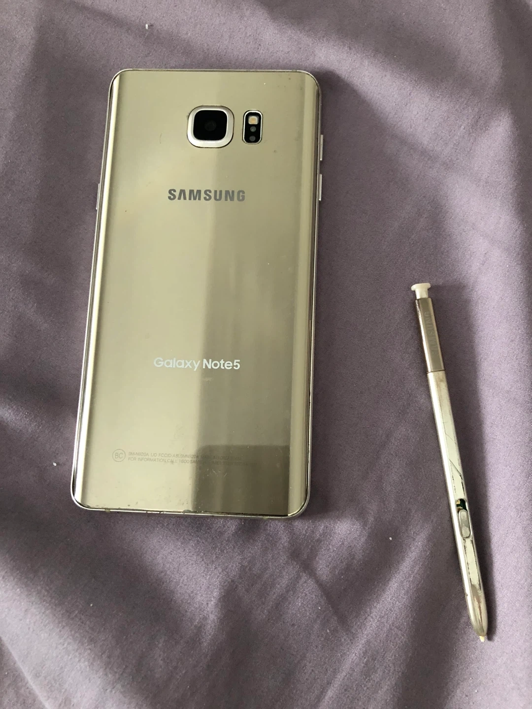 This is a gold Samsung Galaxy Note 5 smartphone. It includes its S Pen stylus. It's ready for setup!
