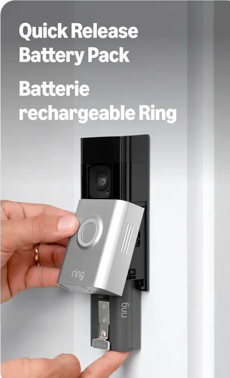 Ring Battery Doorbell Plus with 1536p HD+ video. It features a quick-release rechargeable battery pack. See more at your front door!