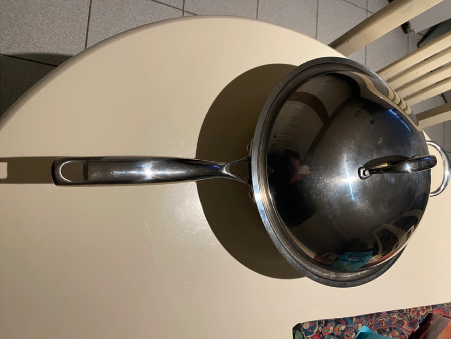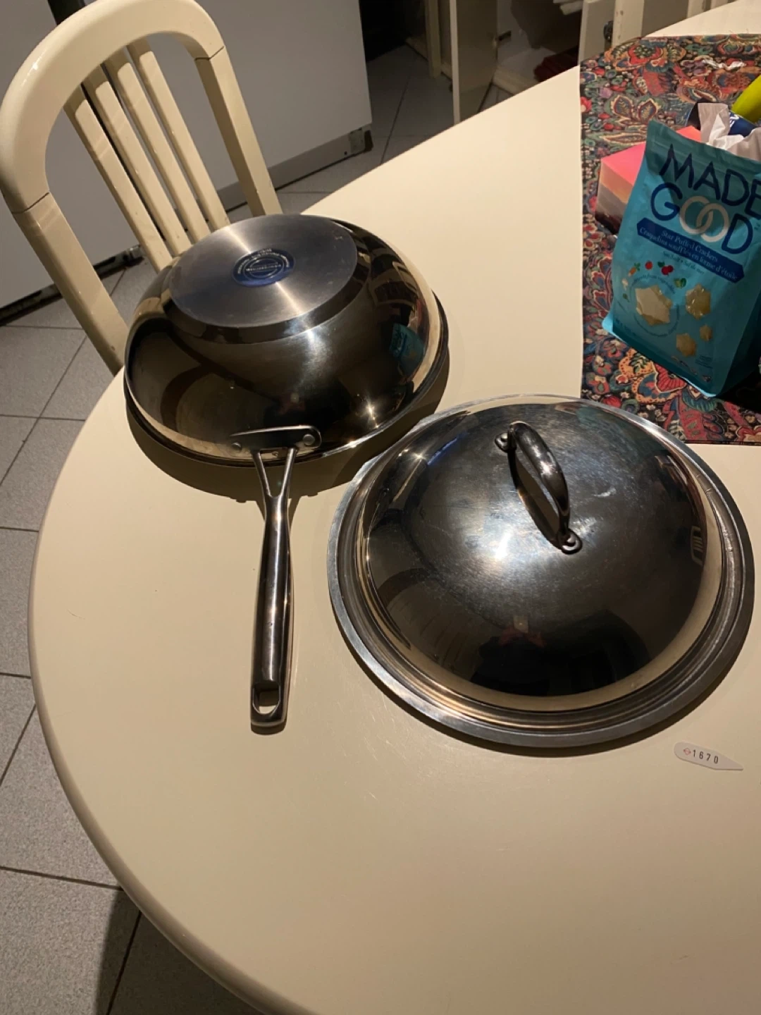 This Cuisinart stainless steel wok comes with a matching lid. It's made of durable stainless steel for excellent heat distribution. The wok's deep shape makes it handy for stir-frying or steaming! Like new only been used once or twice.