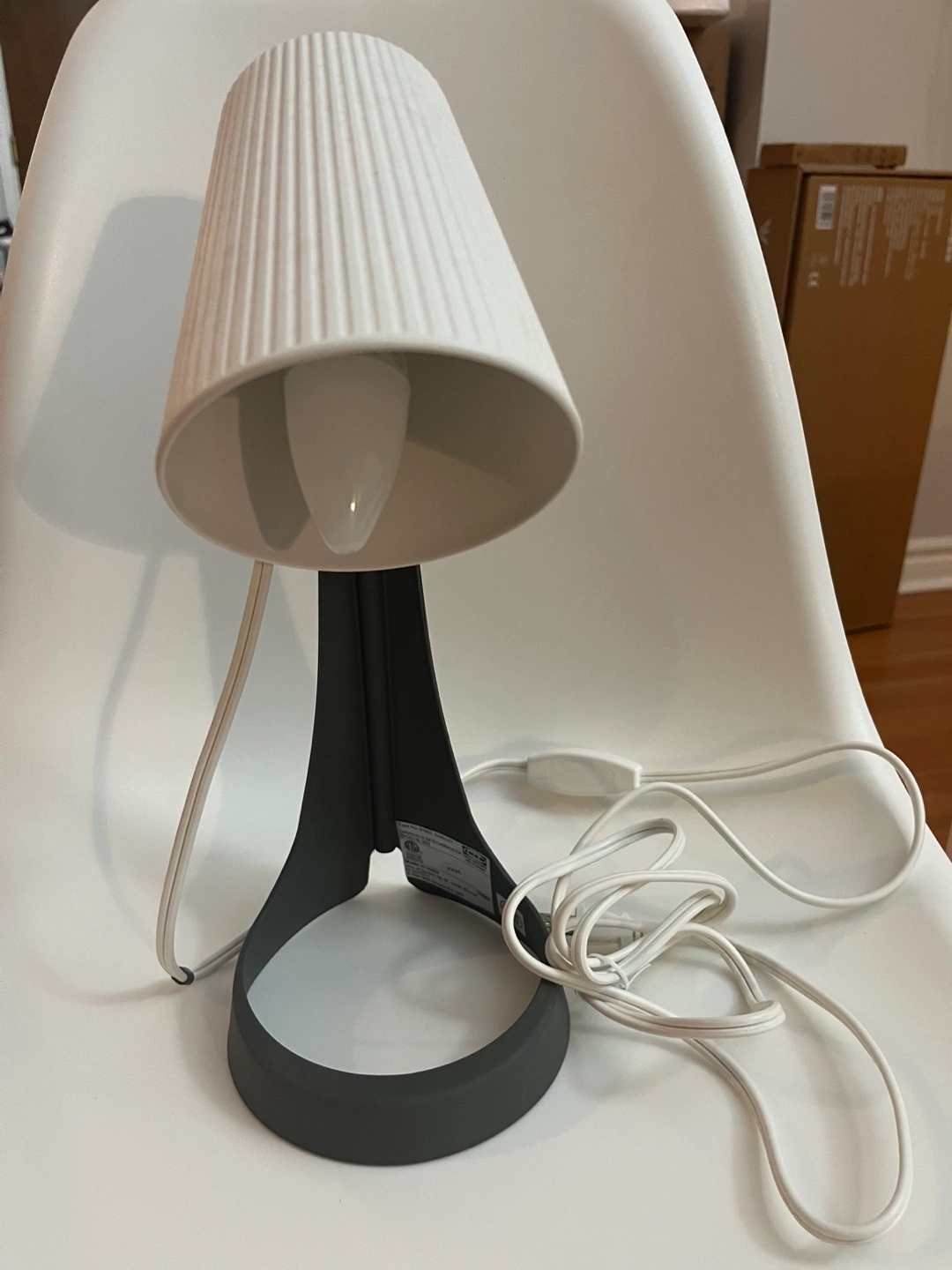 Stylish and functional desk lamp. Dark gray base, white shade. Minimalist design. Perfect for home office or bedroom.