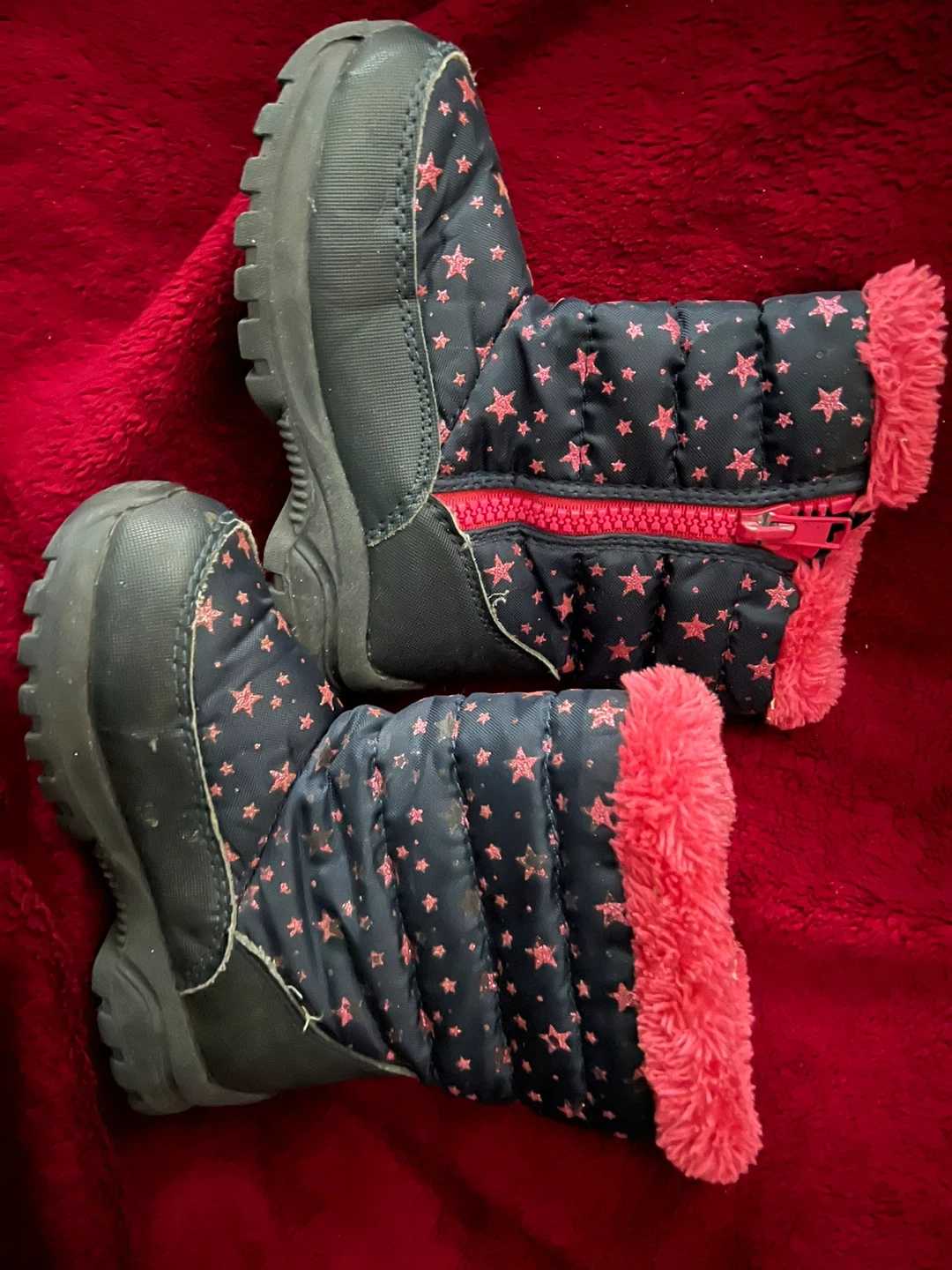 These cute navy blue winter boots for girls feature a fun pink star pattern. They have a cozy faux fur lining and a bright pink zipper closure for easy on and off. Durable treaded soles provide good grip. Keep little feet warm and dry during the colder months! Size 13