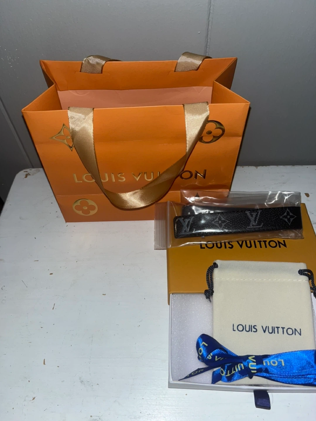 Authentic Louis Vuitton bracelet with signature monogram pattern. It comes with the original shopping bag, box, and dust pouch. This accessory is a stylish addition for any fashion enthusiast.