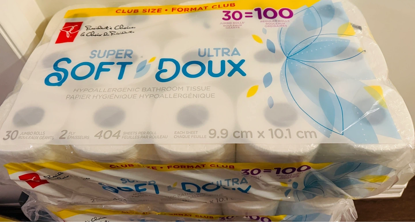 President's Choice Super Soft Ultra Doux hypoallergenic bathroom tissue. Each roll has 404 sheets. These are jumbo rolls measuring 9.9 cm x 10.1 cm.