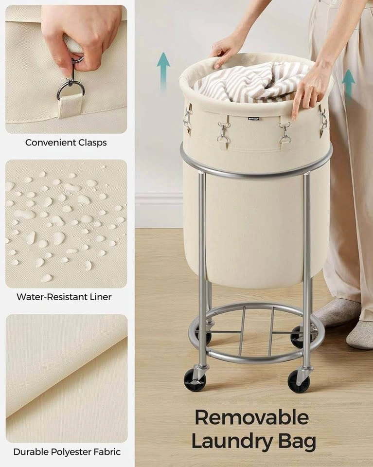 This heavy-duty round laundry basket features a strong steel frame, smooth-rolling wheels, and a removable fabric bag for easy cleaning and transport. Two locking wheels keep it securely in place when needed.