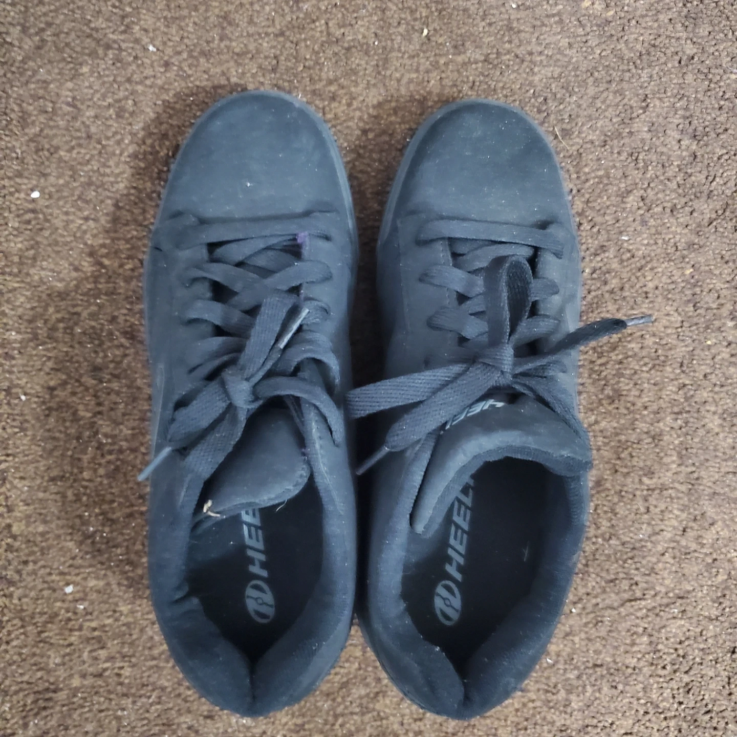 Heelys black roller shoes with laces. These shoes have wheels on the bottom for rolling. They're great for cruising around! Size 8.