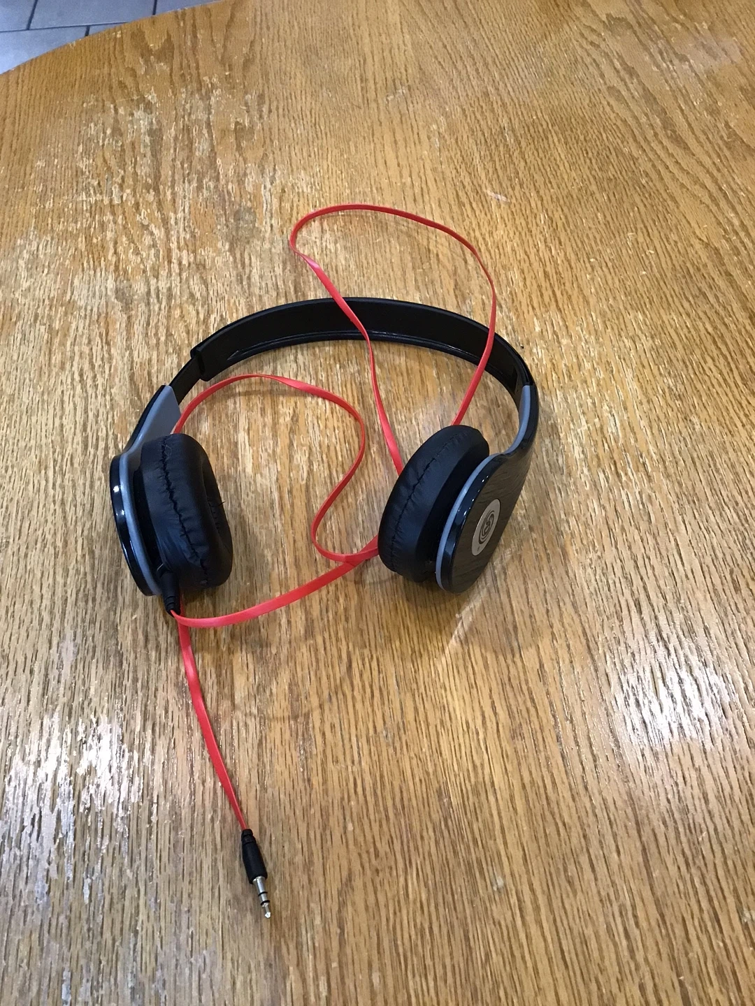 Black over-ear headphones with a red cord. These are wired headphones with a standard 3.5mm audio jack. They offer decent sound for everyday listening.