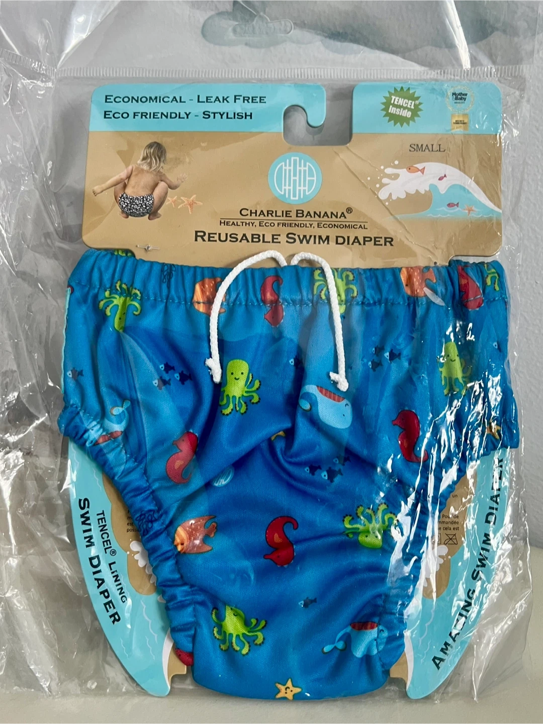 Keep your little one stylish and eco-friendly with this Charlie Banana reusable swim diaper! It's size small and features a fun under-the-sea design. Economical, leak-free, and ready for some splashy fun!