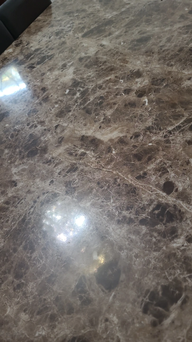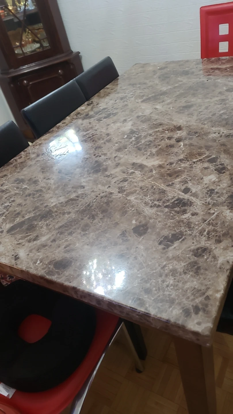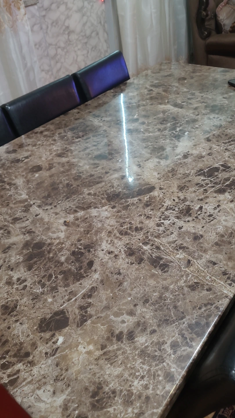 Dining table with a marble-look top. It has a smooth, polished surface. Seats six comfortably.It has small craches but not seen. It's In very good condition. It was bought from bricks. I purchased a new dinning table and want it go by Monday.
