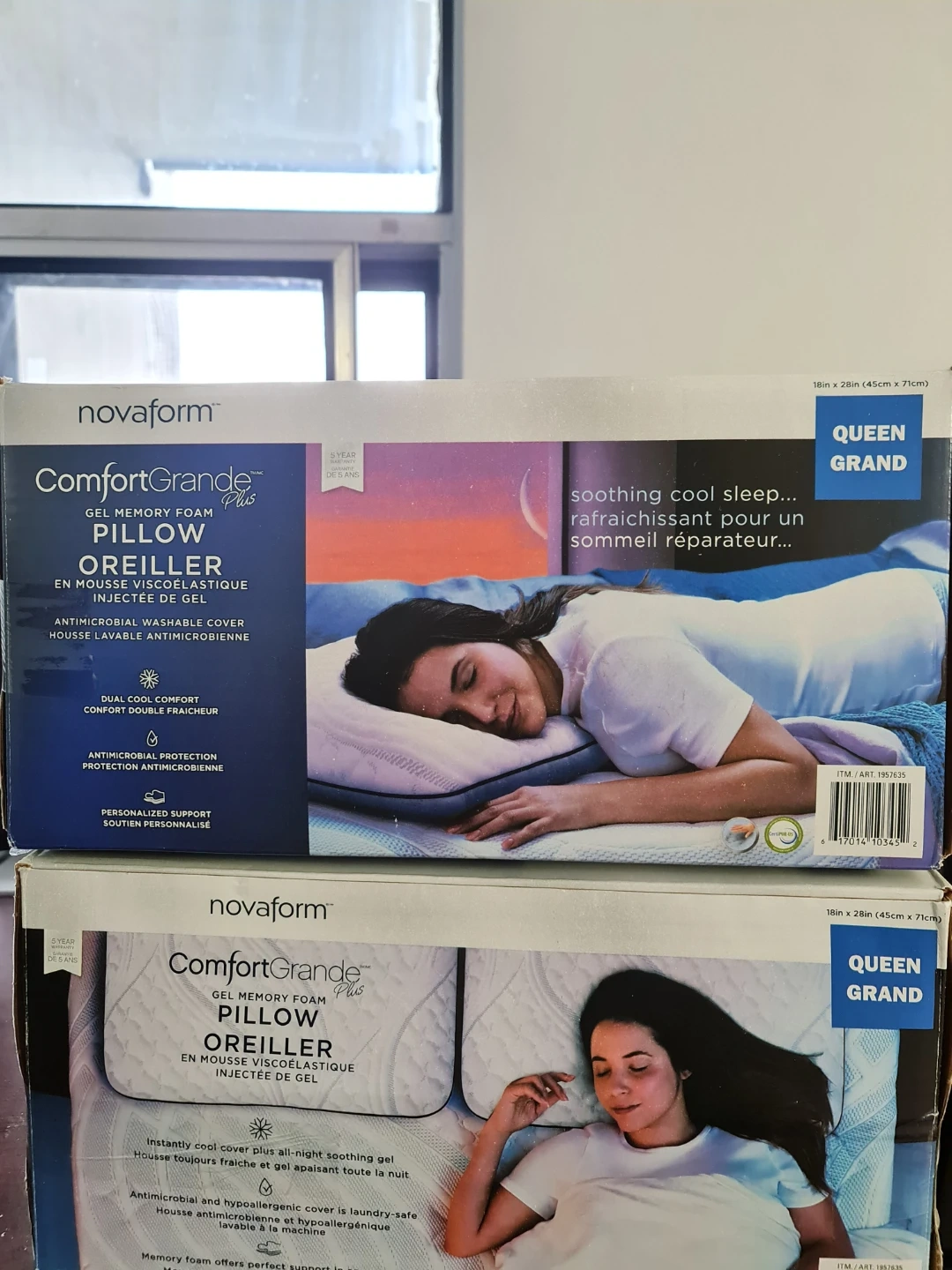 Selling a Novaform ComfortGrande Plus gel memory foam pillow in Queen size. It features an antimicrobial washable cover and dual cool comfort for a soothing cool sleep. The pillow's dimensions are 18in x 28in (45cm x 71cm)