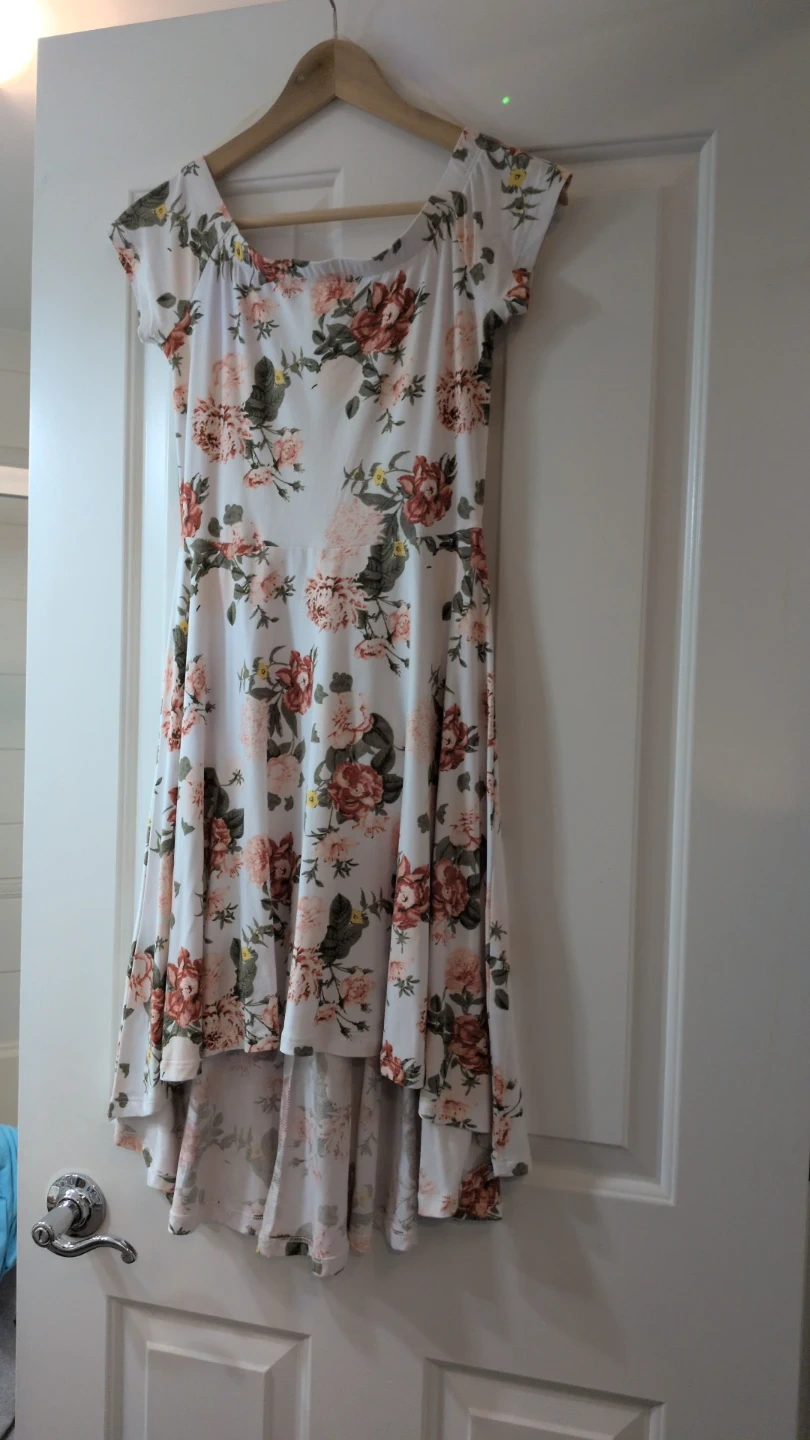 This white Ardene dress features a lovely floral print with red and pink roses and green leaves. It's a size small with a high-low hemline and an off-the-shoulder neckline if you choose to wear it that way. It's a stretchy material and flowy, it is really soft too.