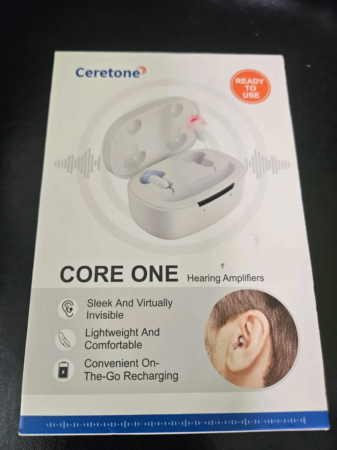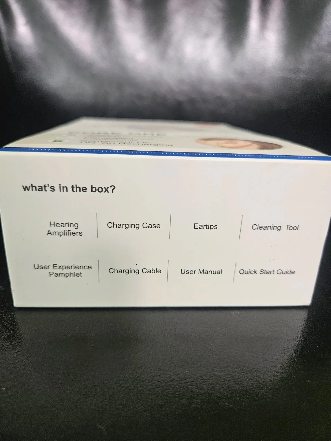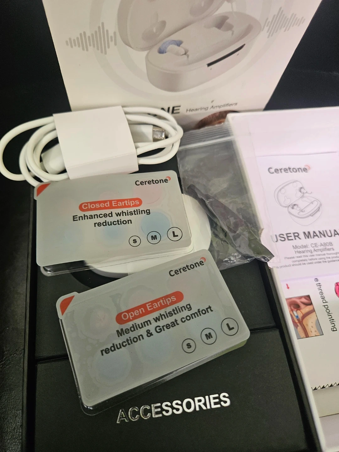 Sleek and virtually invisible hearing amplifiers. They're lightweight, comfortable, and offer convenient on-the-go recharging. This package includes hearing amplifiers, charging case, eartips, cleaning tool, user experience pamphlet, charging cable, user manual, and a quick start guide.