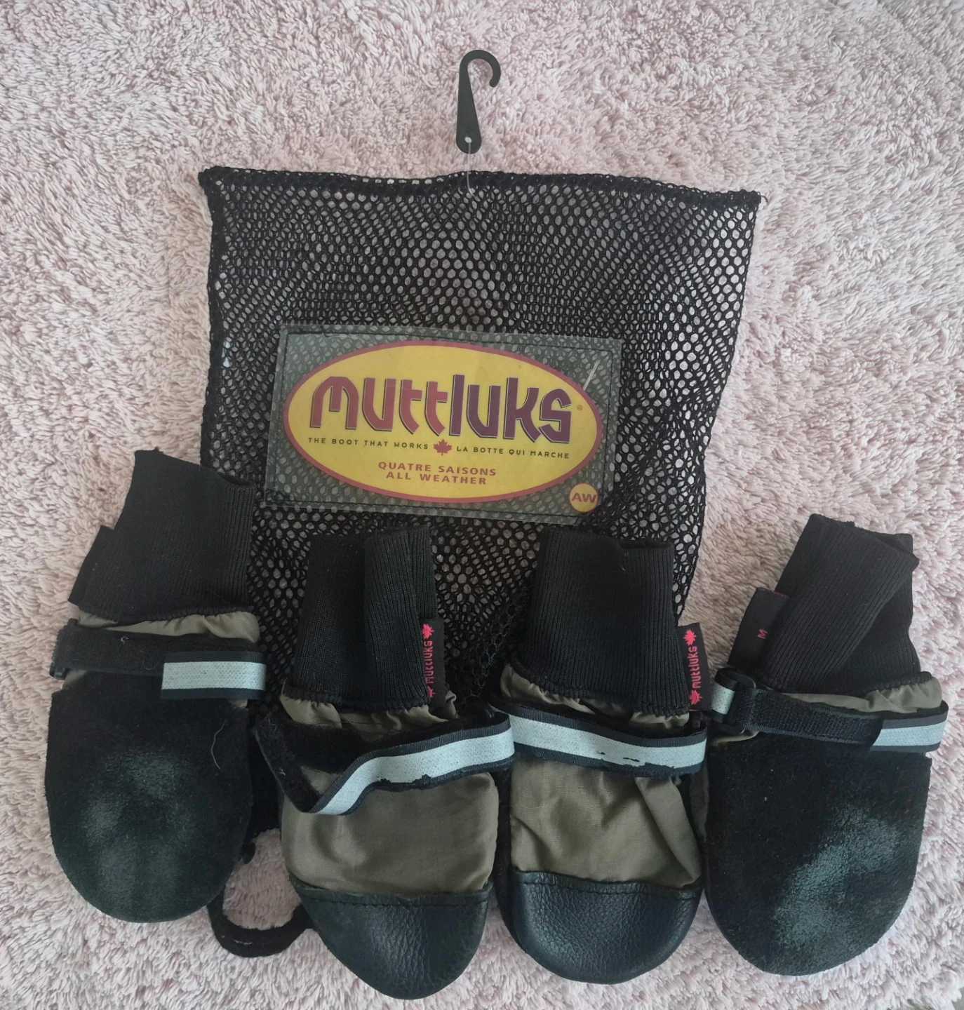 Set of four Muttluks dog boots designed for all-weather use. Includes a mesh carrying bag for easy storage and transport. They're built to be durable for your dog's paws.