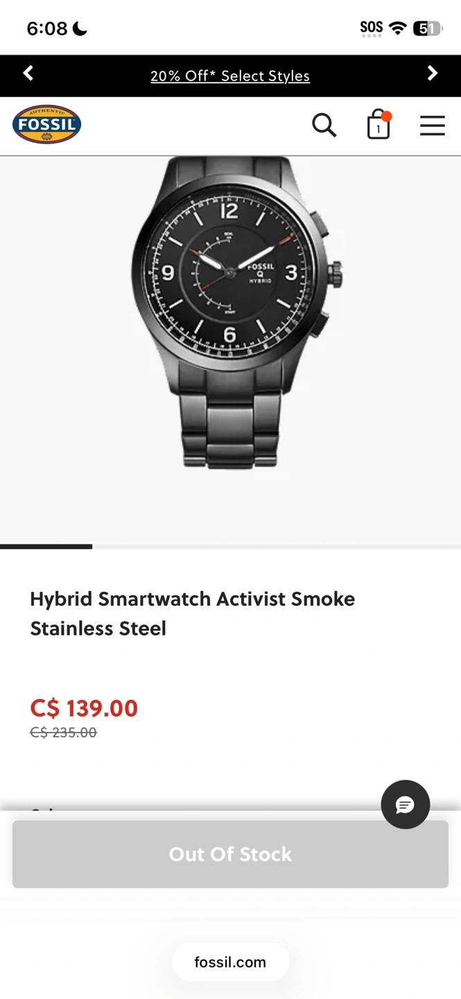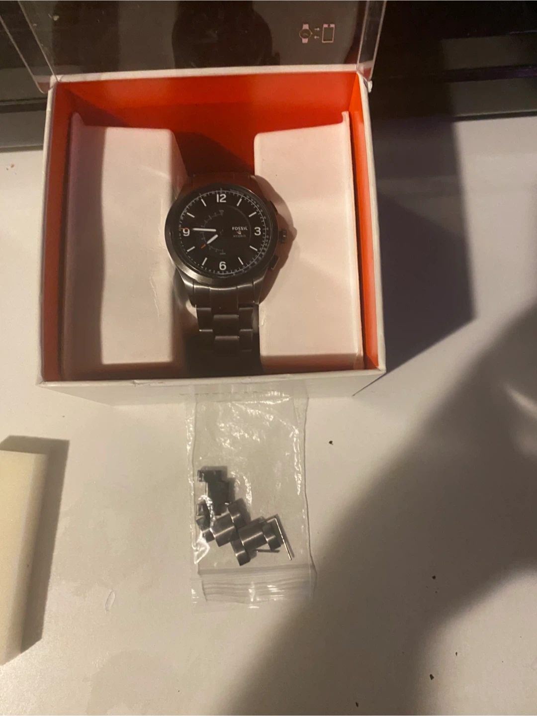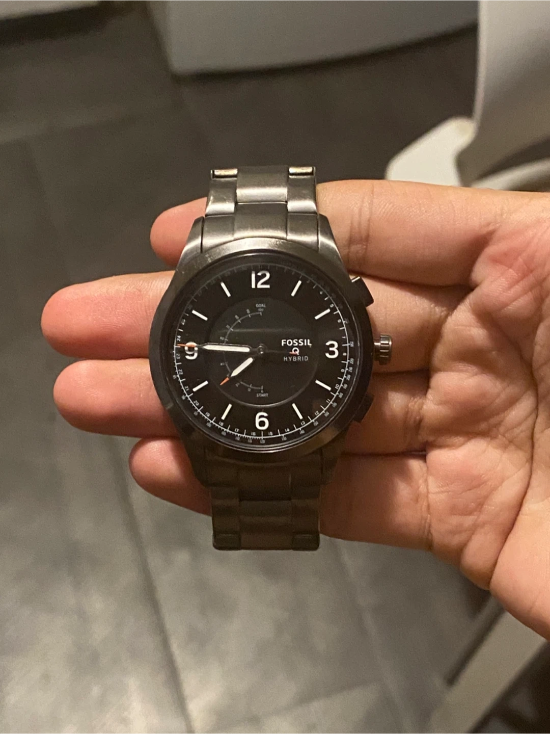 Fossil Hybrid Smartwatch Activist Smoke. This watch has a stainless steel band. It comes with extra links and the original box.
