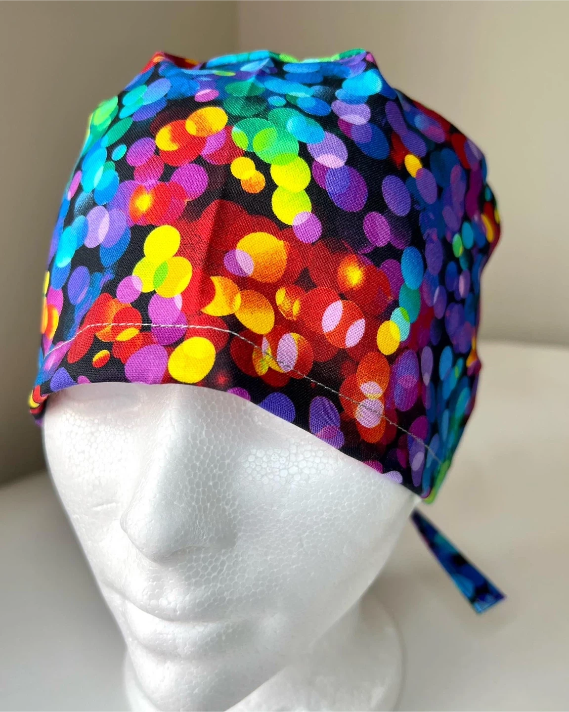Handmade This tie-back scrub cap features a fun, colourful bokeh dot pattern on a black background. It's designed for comfort and adjustability with its tie-back closure. Made from 100% cotton for breathability. Perfect for healthcare professionals looking for a touch of personality!