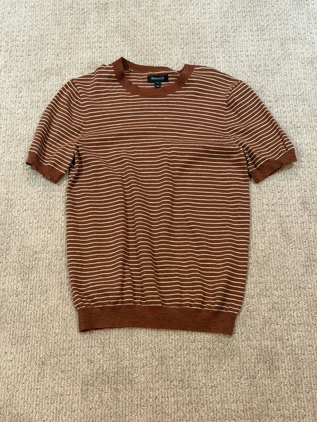 Elevate your casual wardrobe with this RW&CO. striped T-shirt, size small, featuring a stylish brown and white pattern and short sleeves, perfect for a relaxed yet fashionable look. This is a used item.