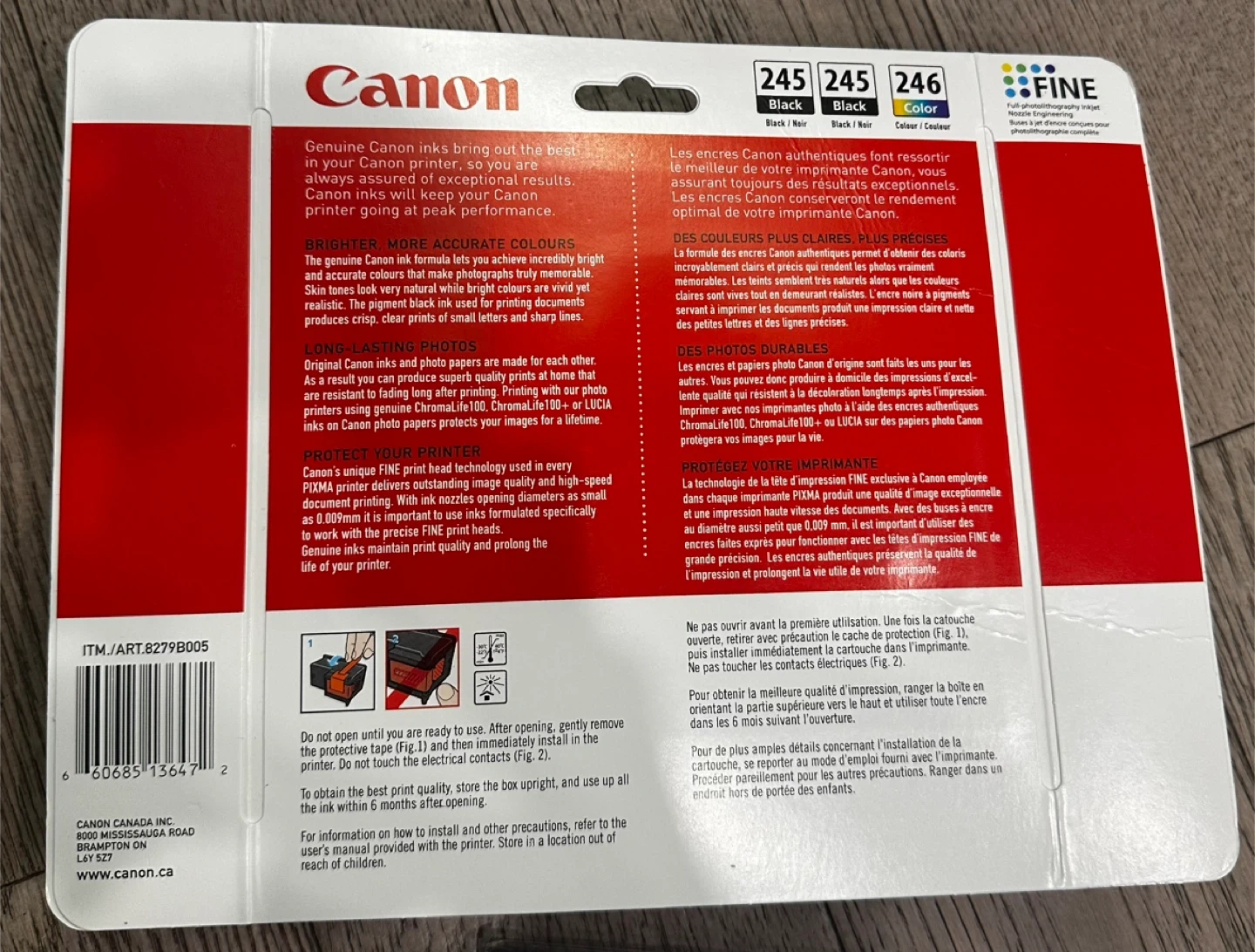 This is a Canon PG-245 black ink cartridge and a CL-246 colour ink cartridge. They're designed for genuine Canon printing. Includes a pack of photo paper.