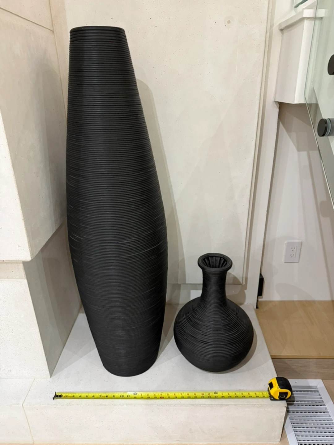 A tall, slender vase and a smaller round vase in a matte black finish. Both have a ribbed texture. The taller vase measures approximately 49 inches in height, and the shorter vase is about 19 inches tall. They're perfect for adding a modern touch to any room.
