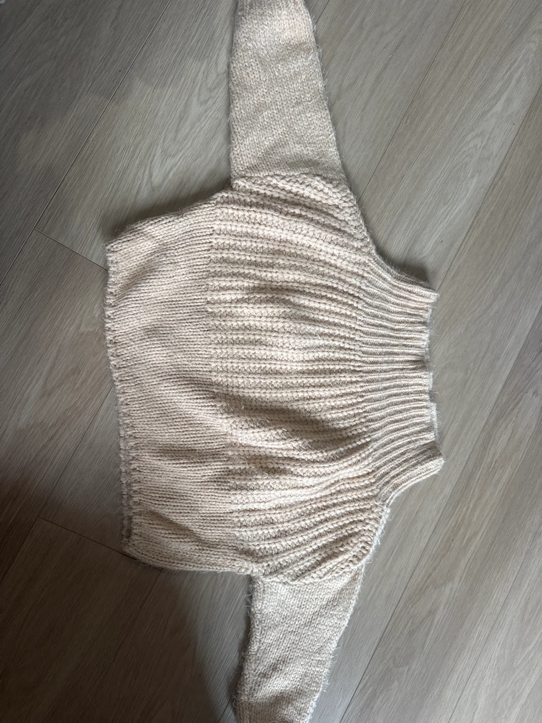 This is a cream-coloured knit sweater. It's made from a soft yarn. The sweater features a ribbed texture on the body and sleeves. It's a cozy piece for cooler weather!