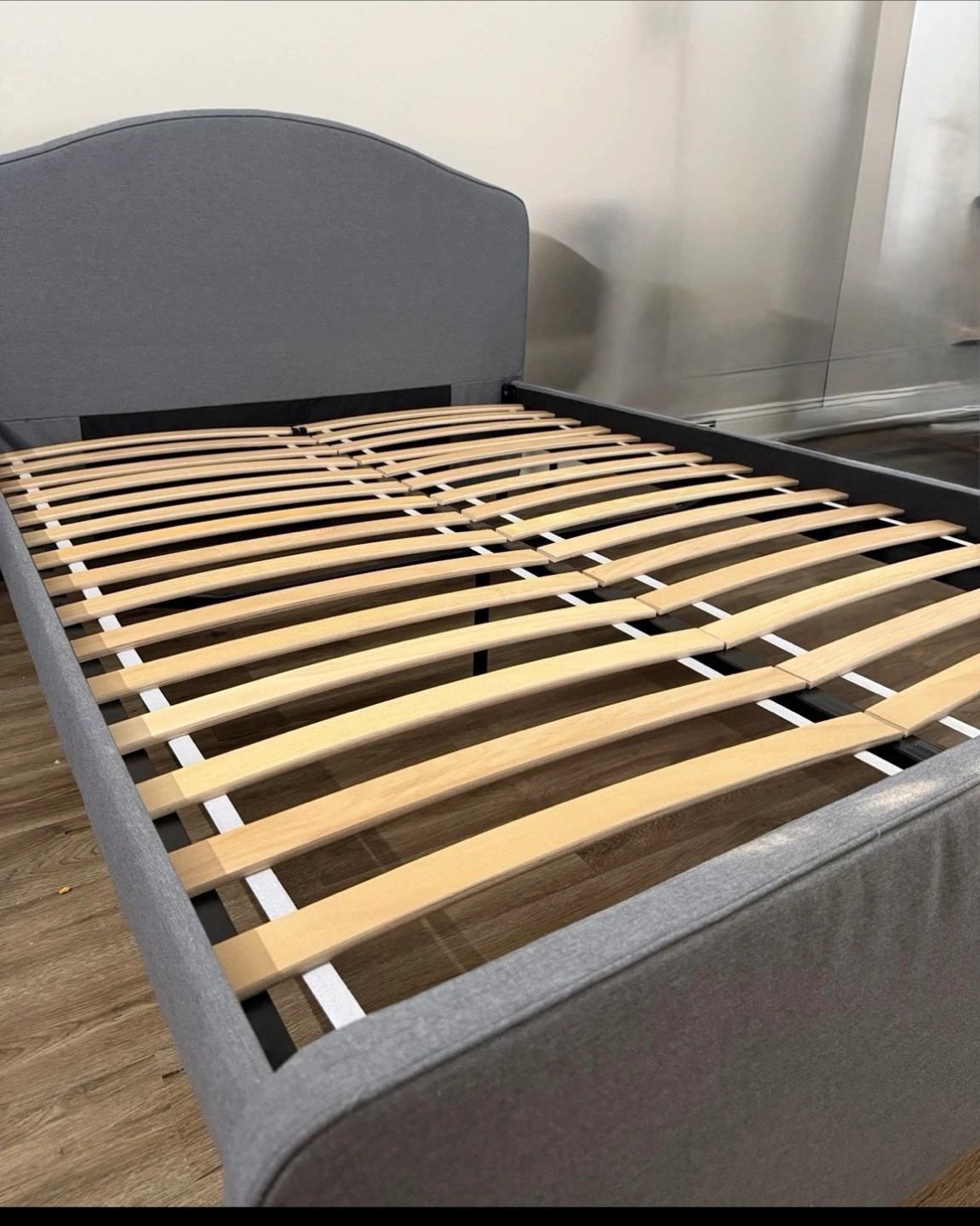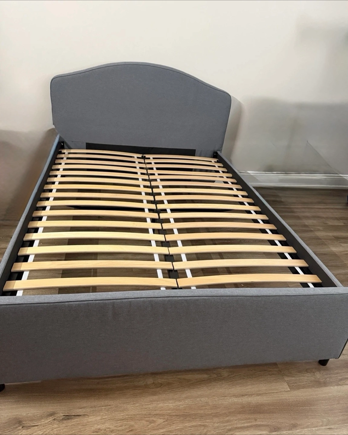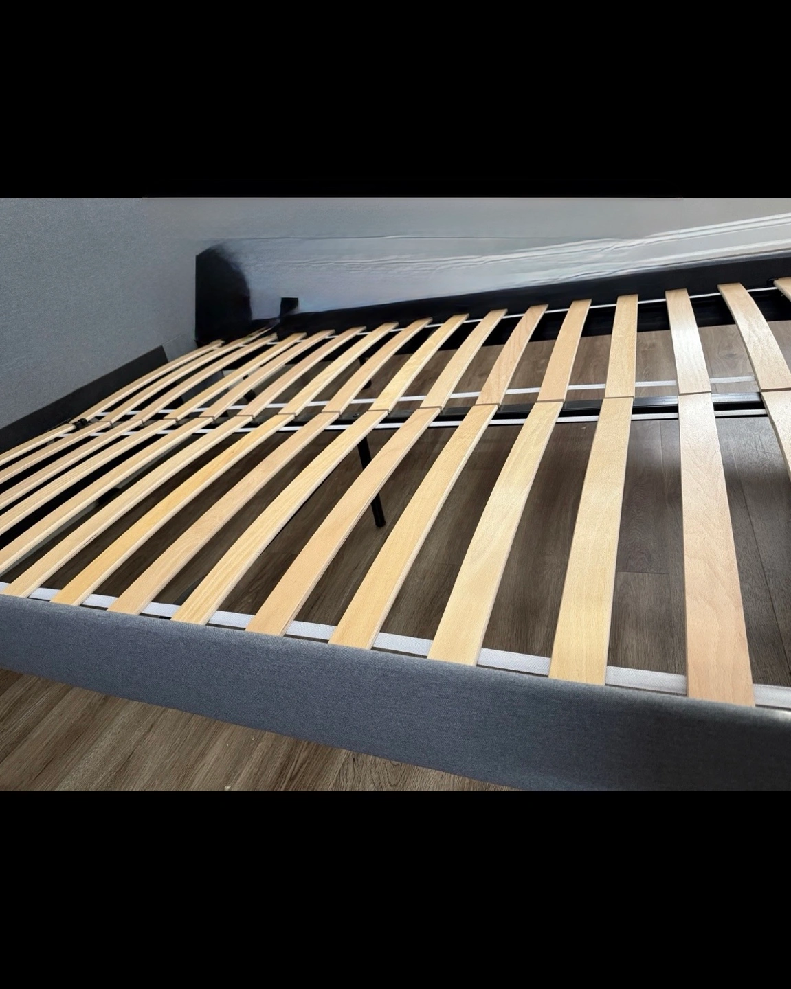 Selling an IKEA Hauga bed frame in gray! It's in great condition. The fabric is 100% polyester. It's a sturdy and stylish bed frame that will look great in any bedroom. Queen size