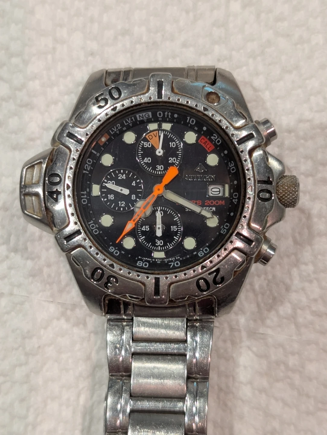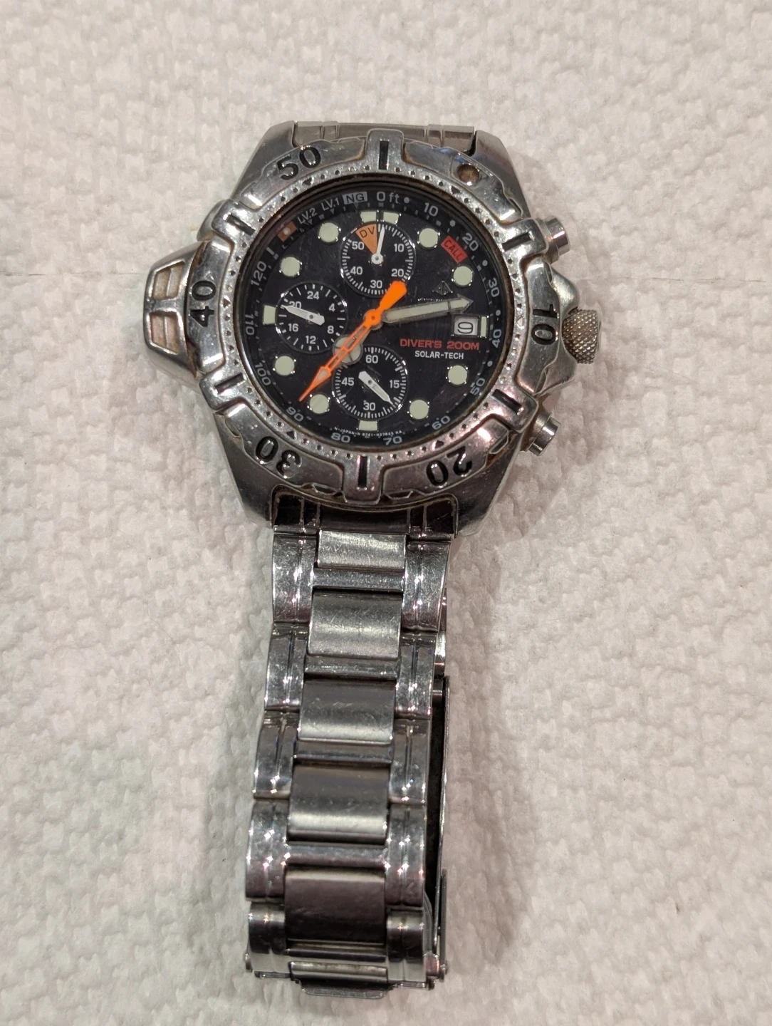 Vintage Citizen Eco-Drive Diver Chronograph Aqualand Promaster watch. Water resistant to 200M. Features multiple subdials and a rotating bezel. Solar-powered, watch is in good condition perfectly works.
