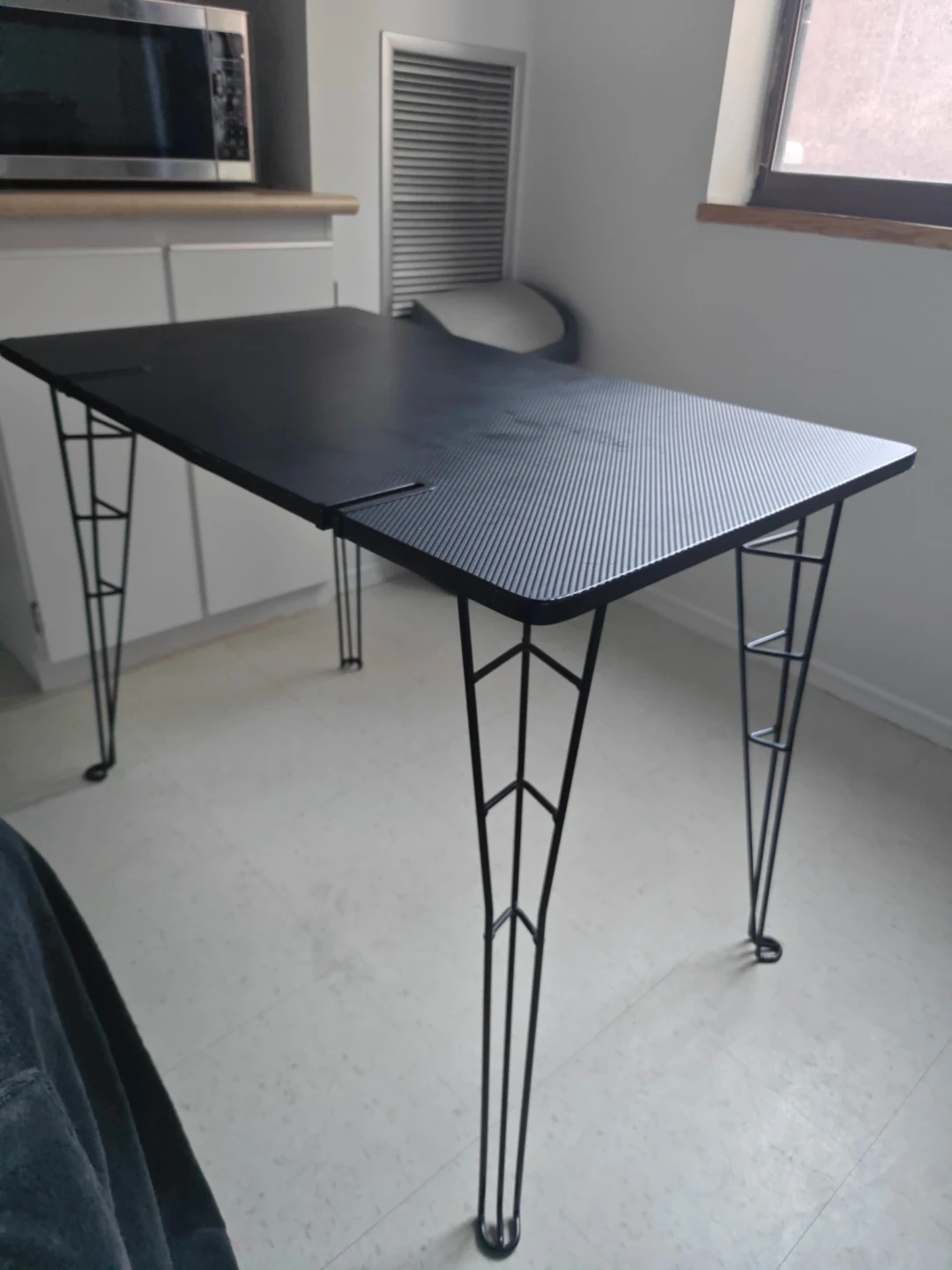 This is a black dining table/desk with a metal frame and legs. It's a good size for a small dining area or works great as a desk! The table's design is modern and sleek.