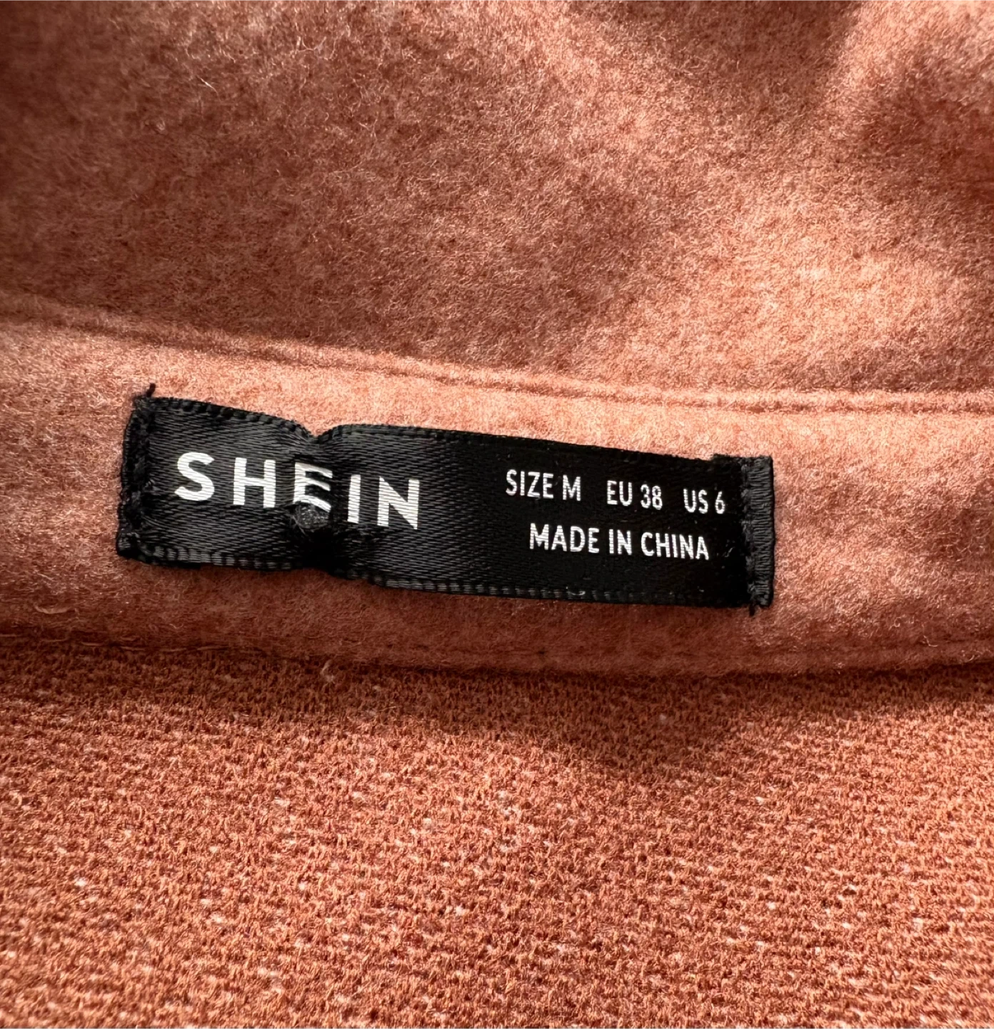 This is a rose brown button-up shirt jacket from SHEIN. It's a size medium with EU 38 and US 6 sizing. It features two chest pockets and button cuffs. The material looks like a brushed wool blend. It's a nice layering piece for cooler weather!