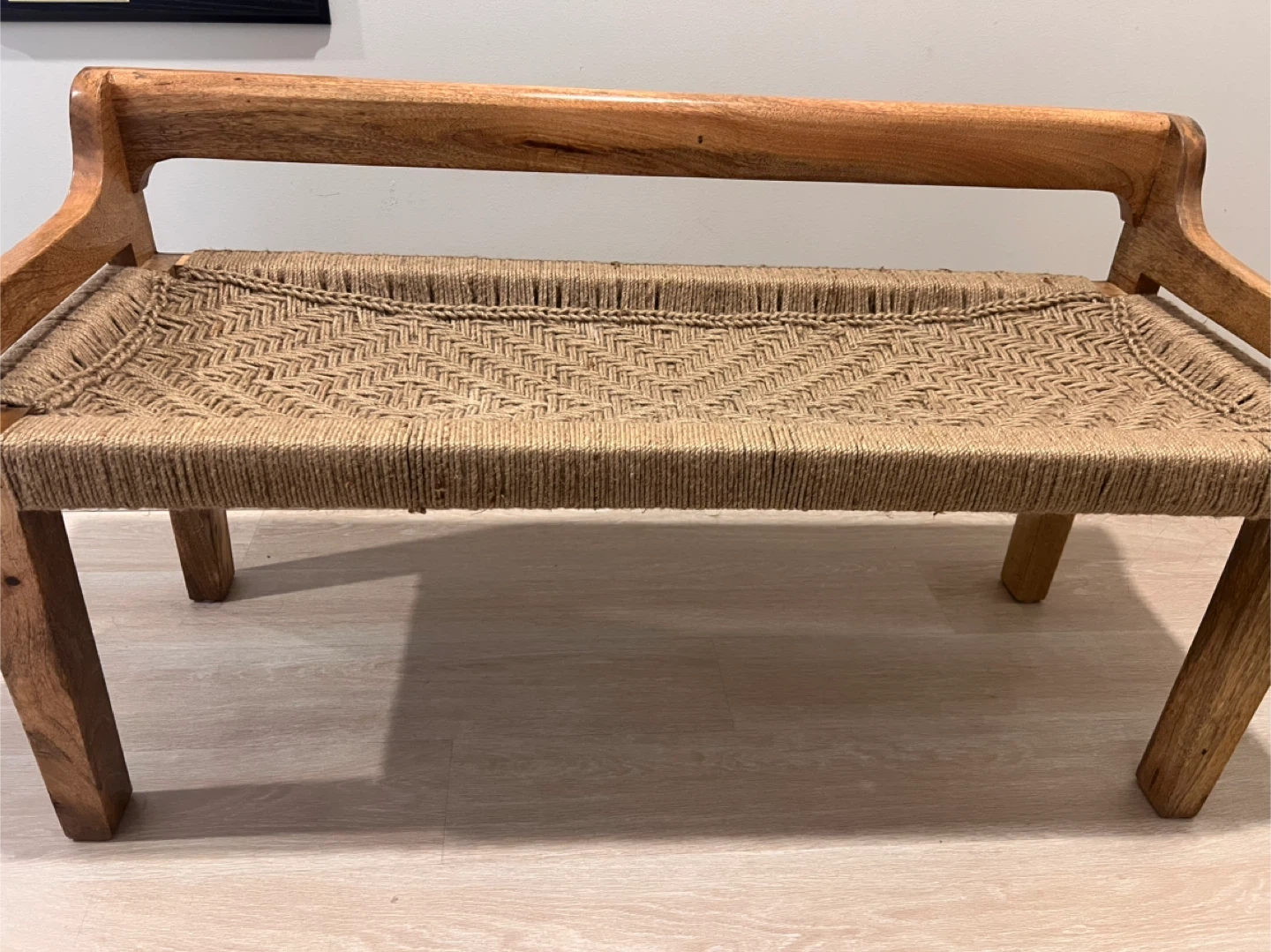 This bench features a solid wood frame with a tightly woven jute seat. It's sturdy and offers a natural, rustic aesthetic. Wood and jute material. Perfect for an entryway or as extra seating.