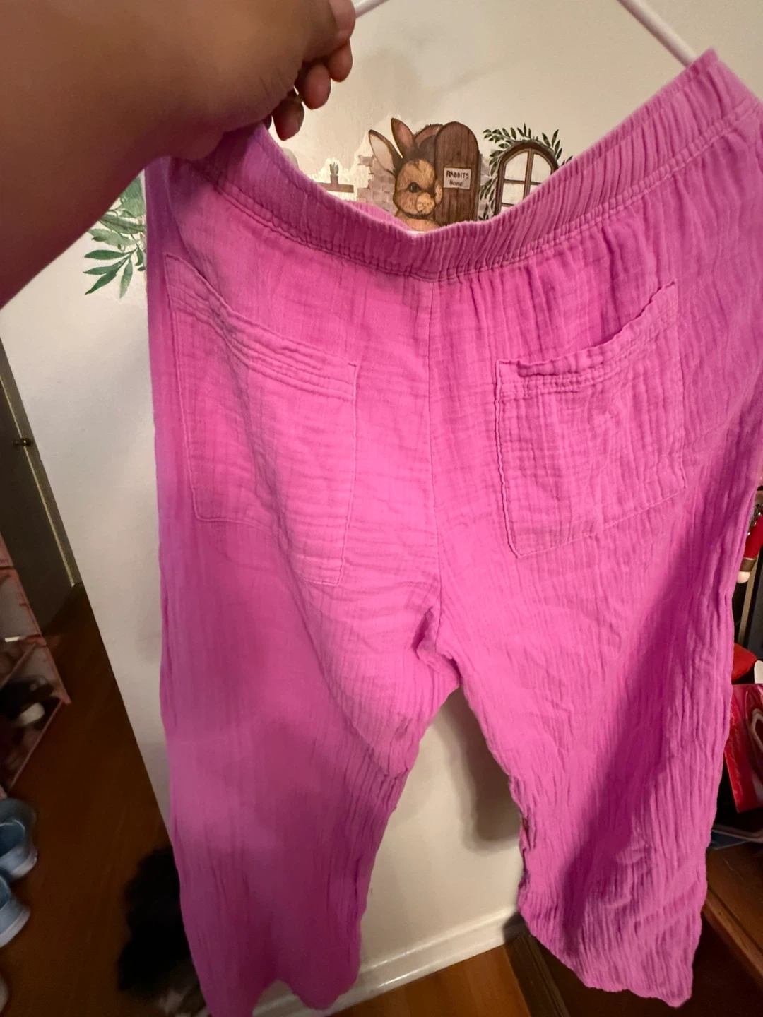 These are a super comfy pair of Gap pants! They are a size small and made of 100% cotton. The garment dyed style means each pair is unique, with slight variations in colour. They're in great shape and ready for a new home