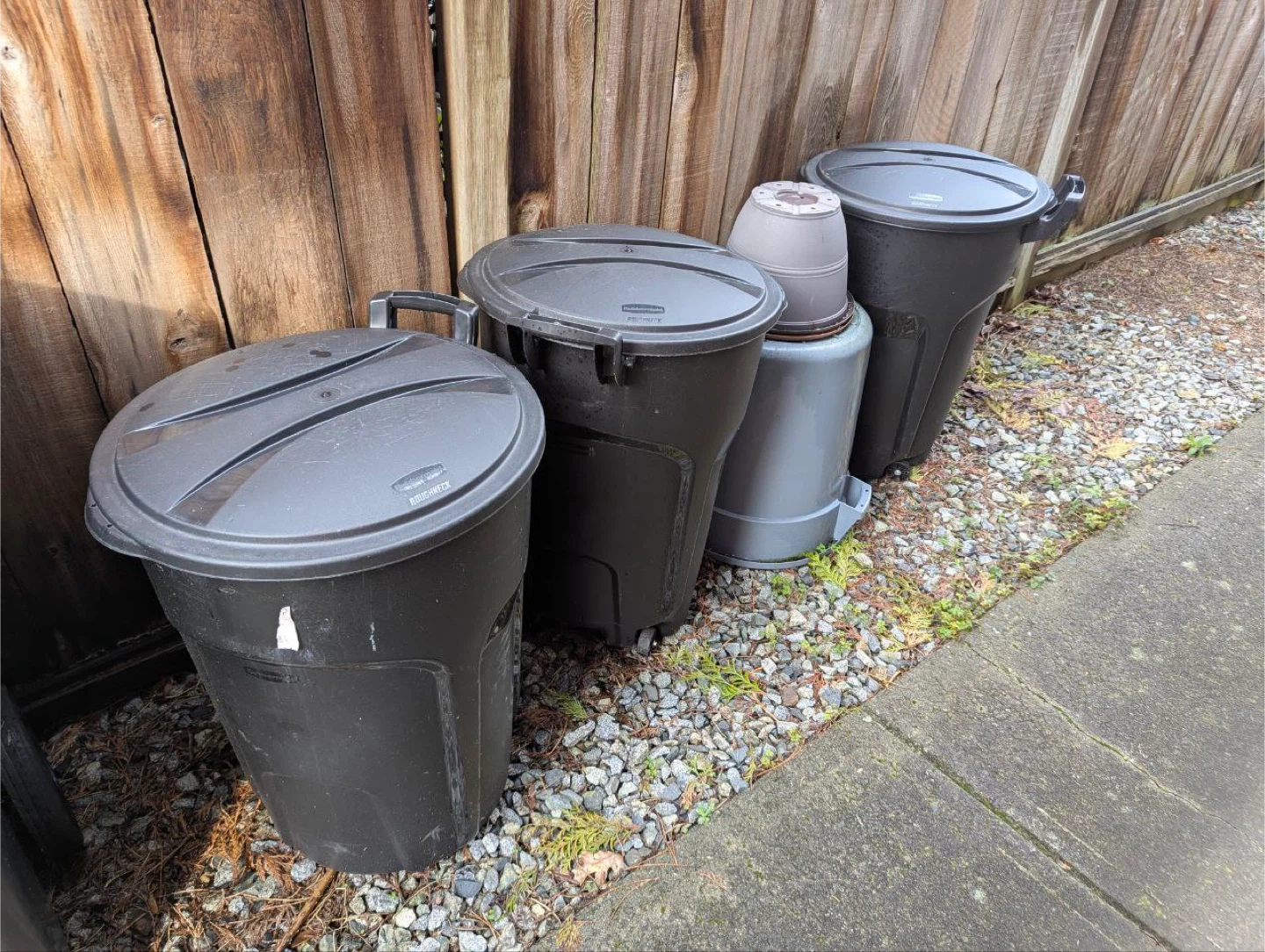 Moving away sale. 3 large Rubbermaid Roughneck trash cans, each with a 32-gallon capacity. They're durable and made of heavy-duty plastic. Includes lids.