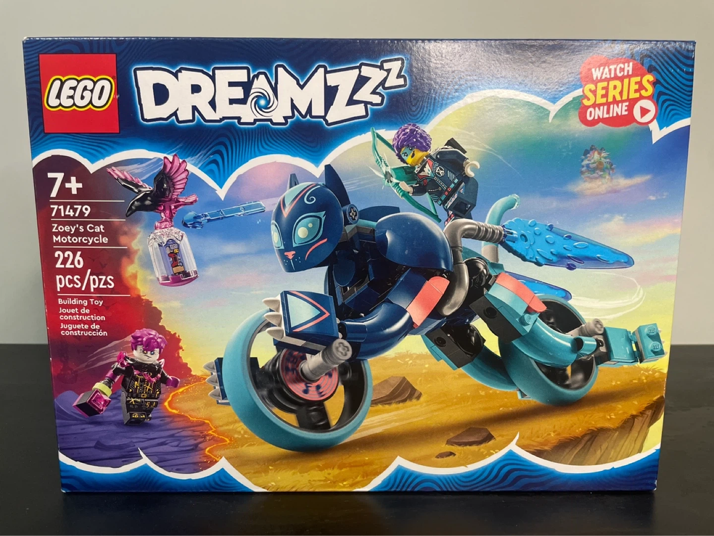 This is the LEGO DREAMZzz Zoey's Cat Motorcycle set, model number 71479. It includes 226 pieces for building a cool motorcycle. It's recommended for ages 7 and up. Fun for builders who love fantasy and adventure!