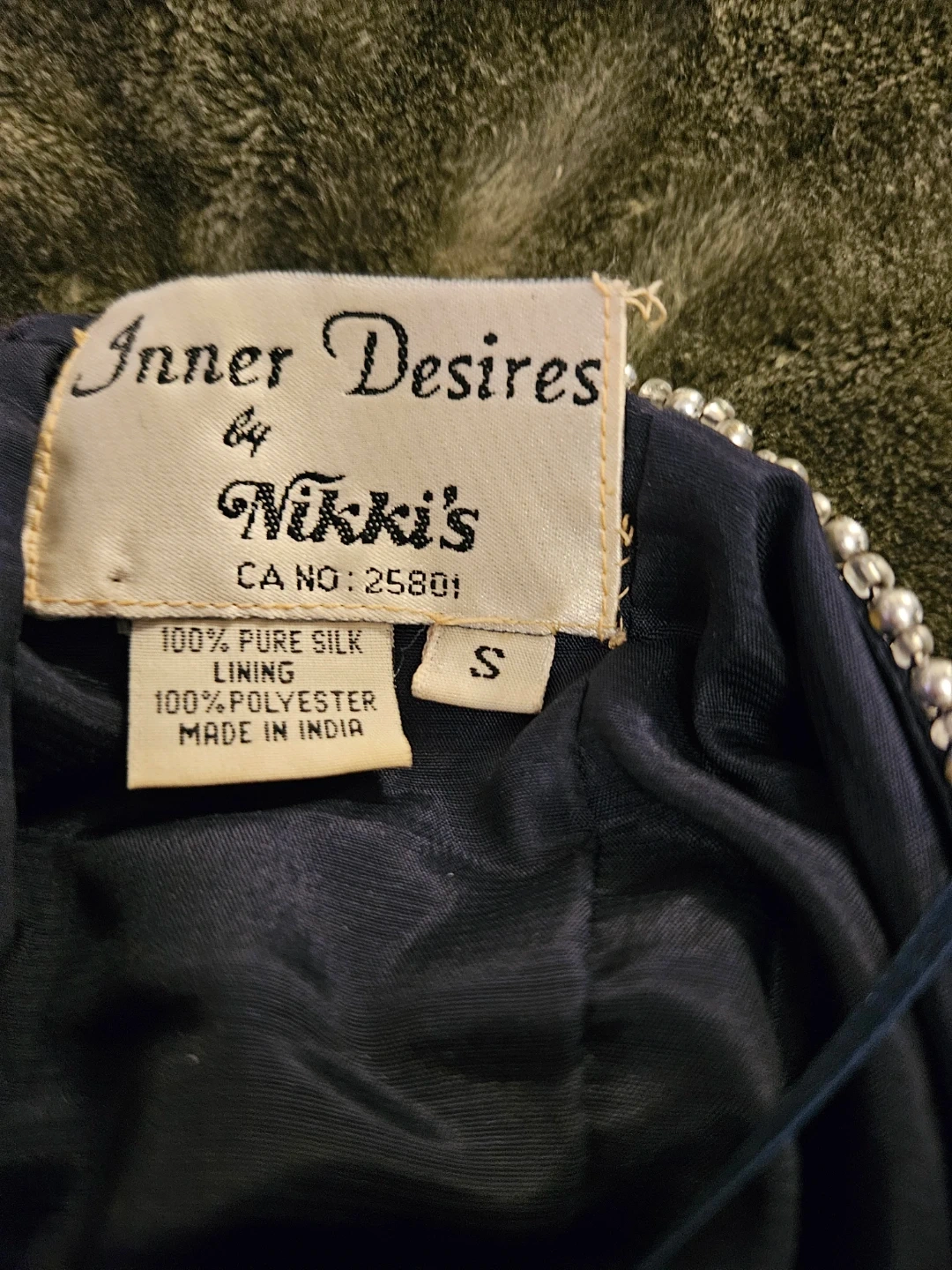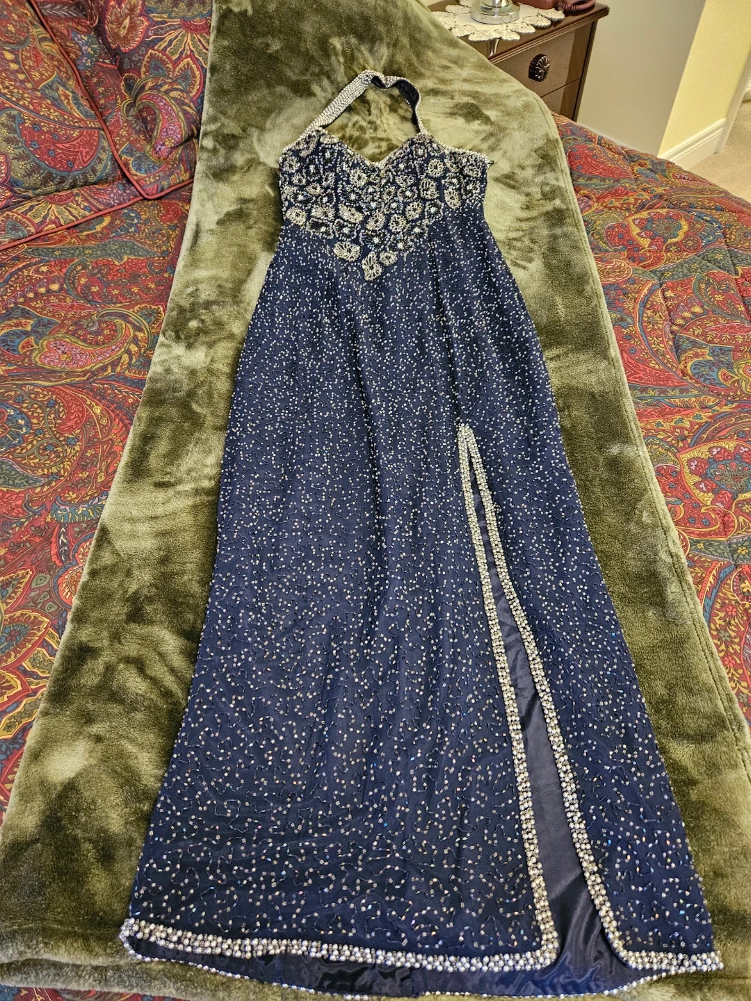 Beautiful navy blue halter dress from Inner Desires by Nikki's. It features intricate all-over beading and a high slit. Made with 100% pure silk lining and 100% polyester shell. Perfect for a special occasion!