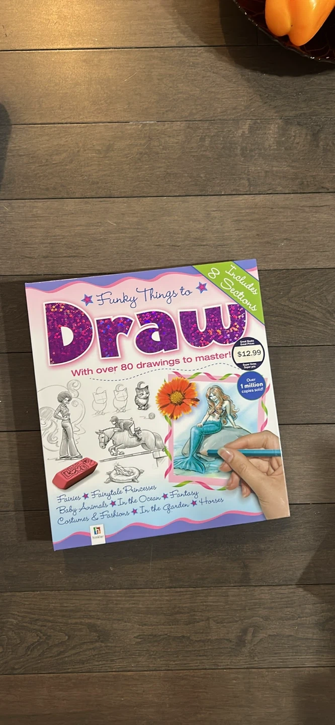 Funky Things to Draw book with over 80 drawings to master! Includes 8 sections: Fairies, Fairytale Princesses, In the Ocean, Fantasy, Baby Animals, In the Garden, Horses, Costumes & Fashions