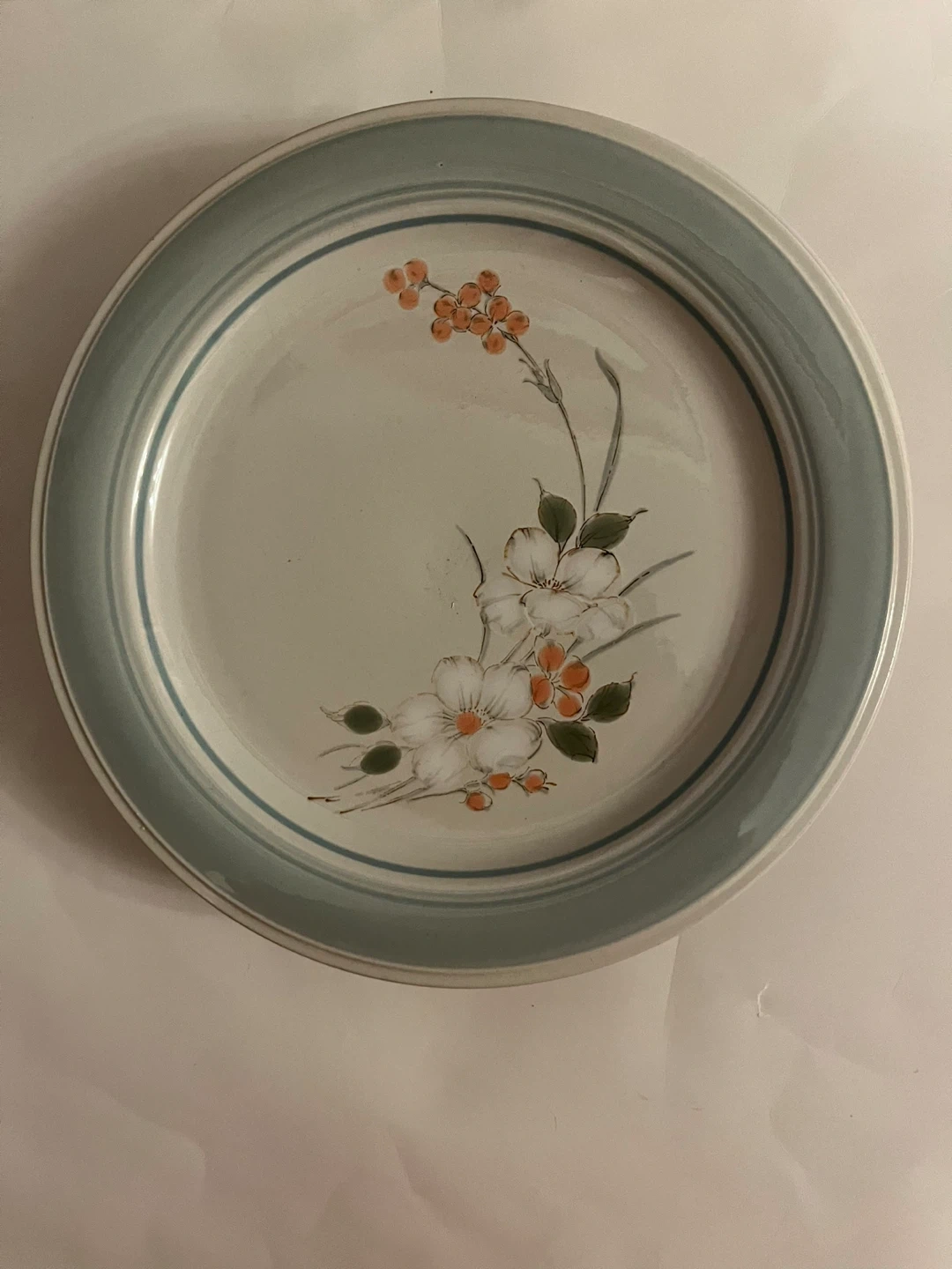A lovely dinner plate featuring a delicate floral and berry pattern. It has a pale blue striped rim. This piece would be a nice addition to a country-style kitchen. Stoneware Japan dinner plates. 5 pieces.