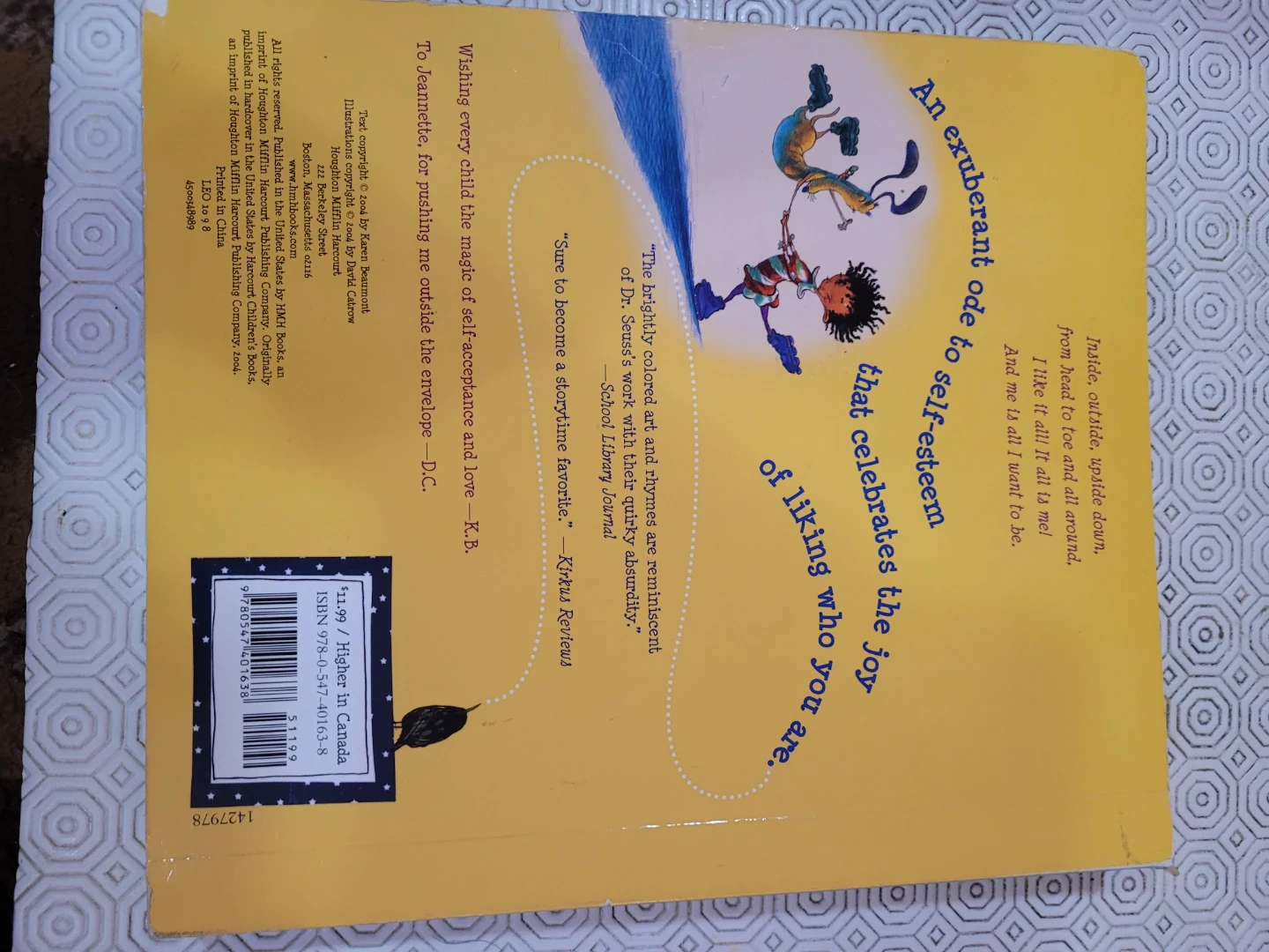 This is the "I Like Myself!" children's book by Karen Beaumont, illustrated by David Catrow. It celebrates self-acceptance and self-esteem. The book has colourful illustrations and rhyming text.
