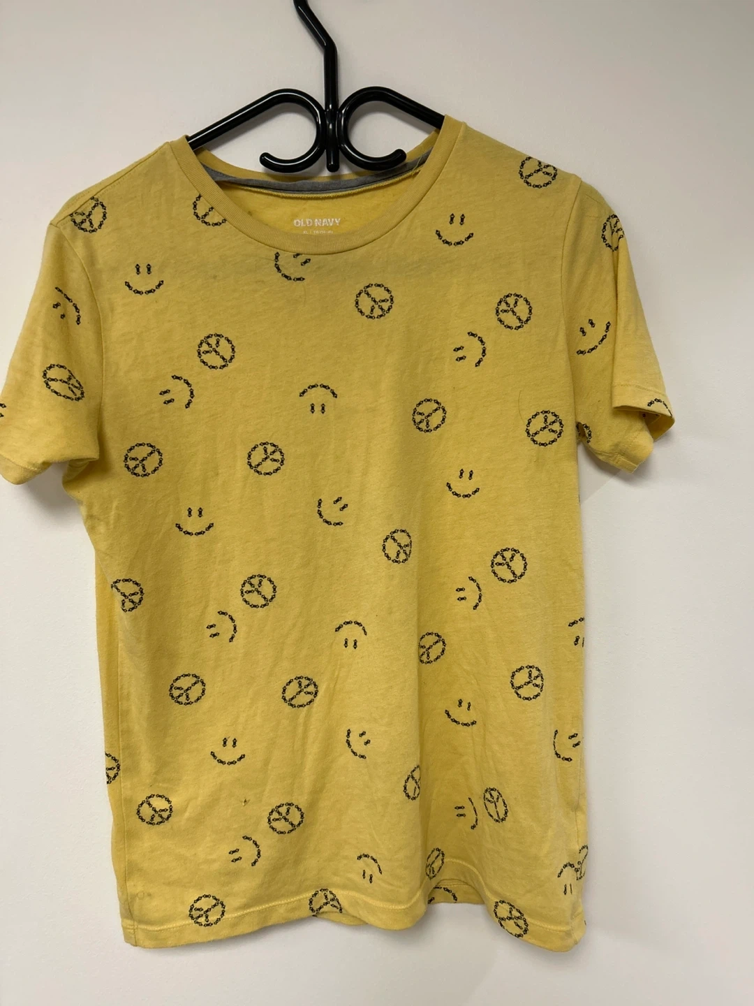 This is a yellow t-shirt from Old Navy with a repeating pattern of smiley faces and peace signs. It's made of a comfortable cotton blend. This shirt is great for casual wear or adding a fun touch to an outfit!