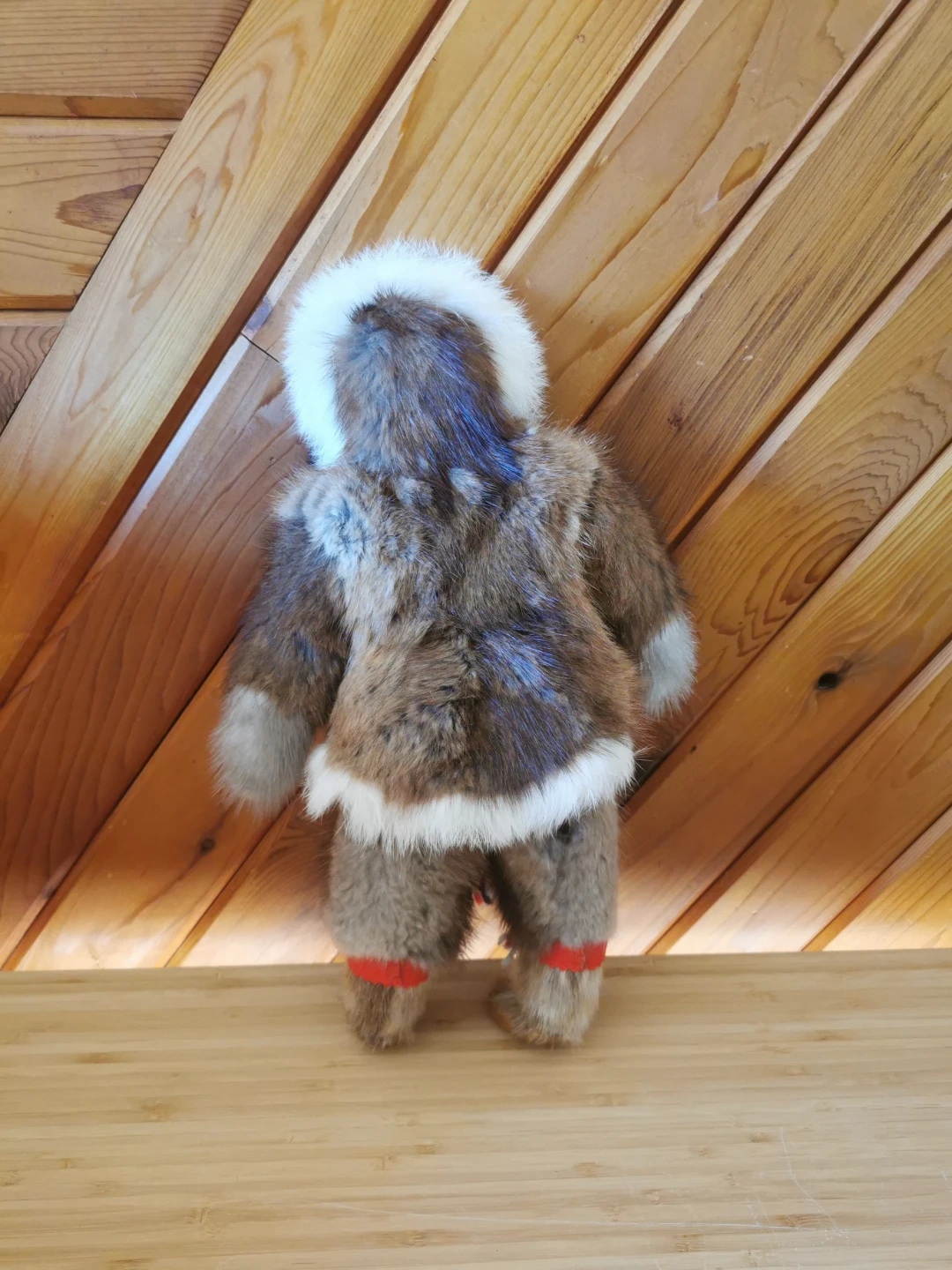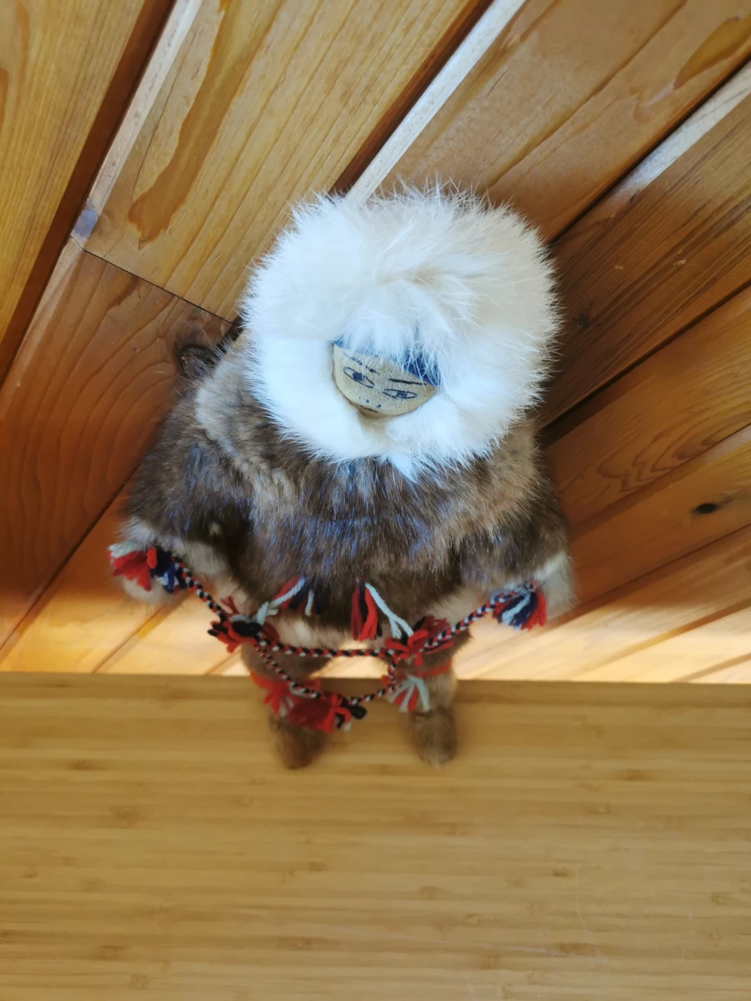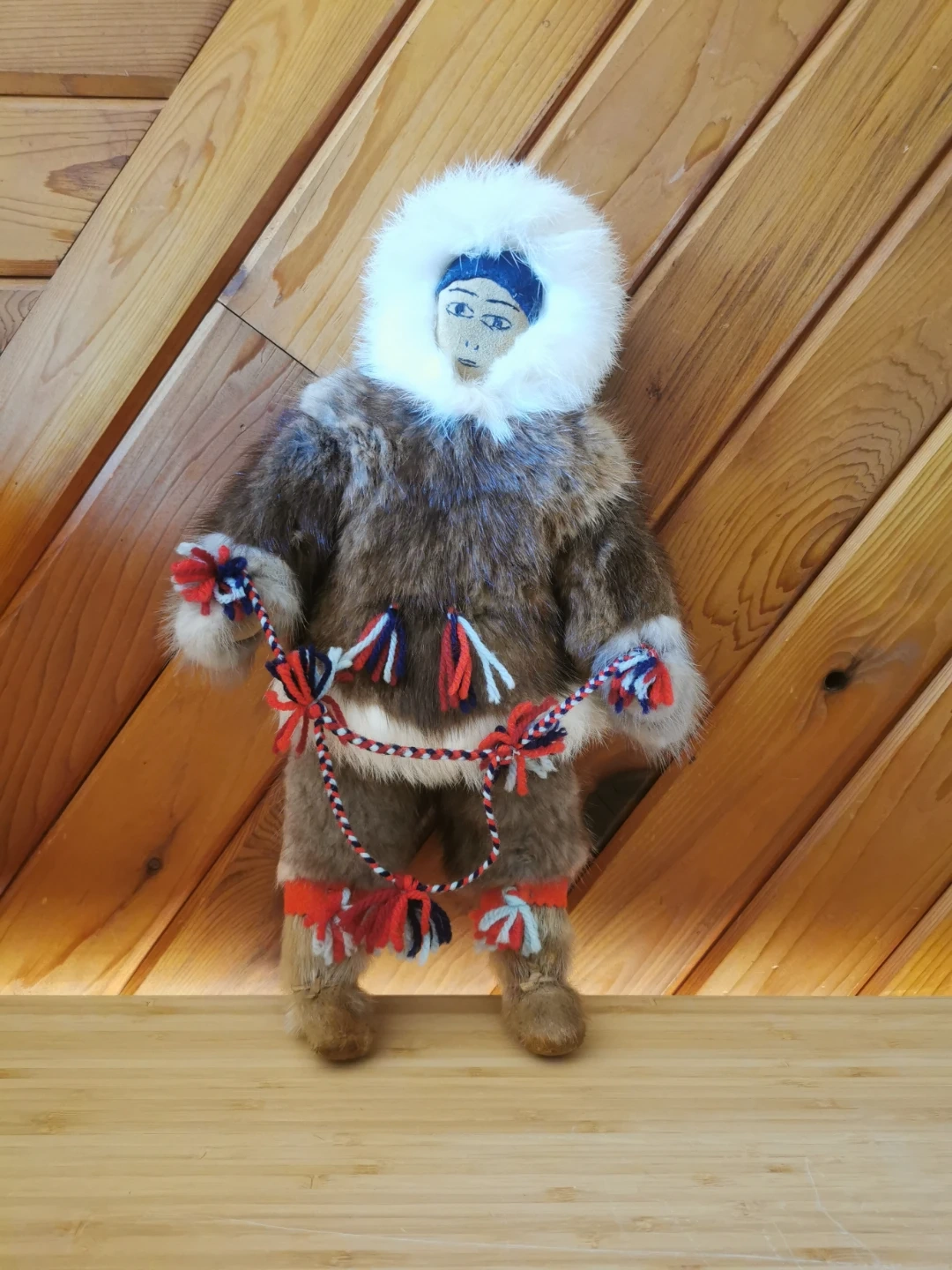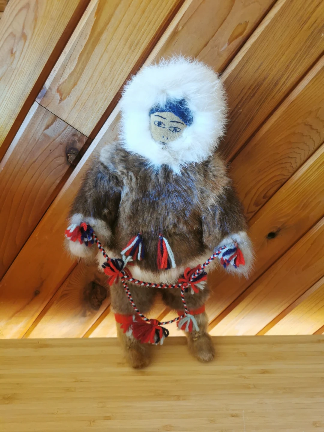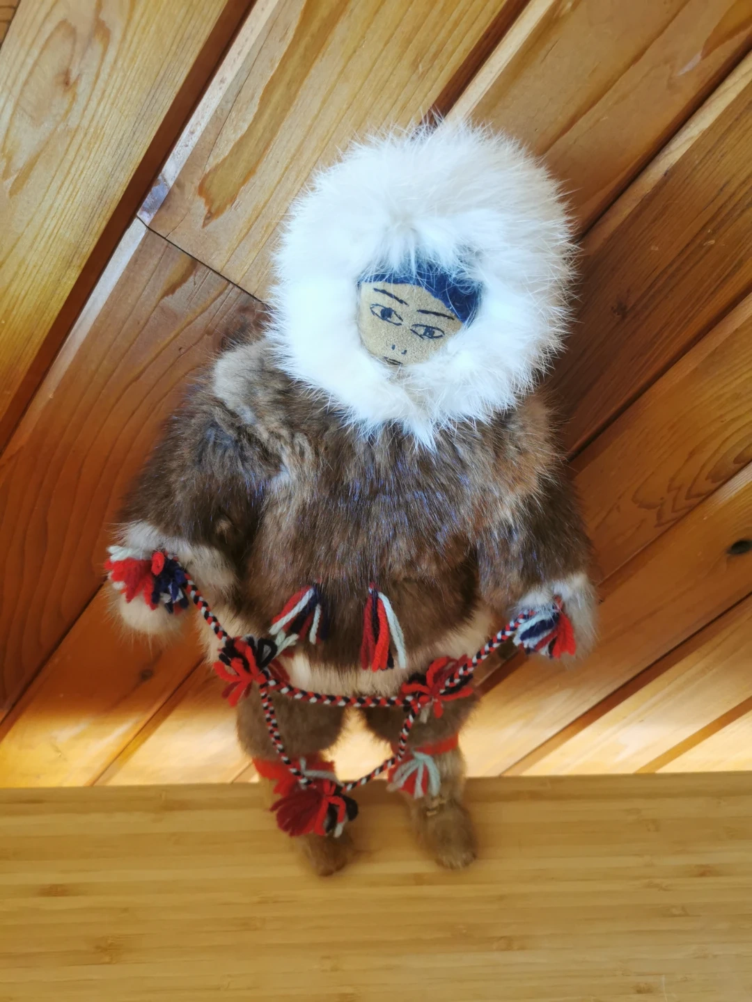 The face is hand-painted, giving the doll a unique and expressive character. The craftsmanship and natural materials reflect classic Northern Canadian folk art and traditional cold-climate design.