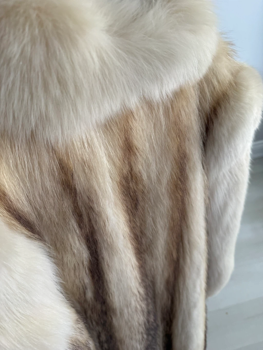 This vintage fur coat is from Peter Gaye Fur Gallery, Winnipeg, Canada. It features a beautiful striped pattern with cream and brown tones. It's a stunning piece for any fashion enthusiast!