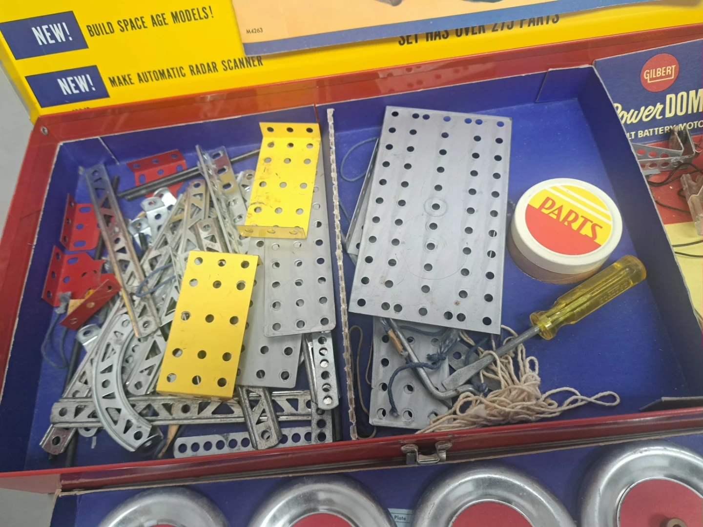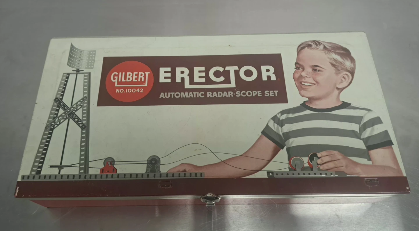 Selling a vintage Gilbert Erector Automatic Radar-Scope Set No. 10042. This set includes various metal parts, plates, wheels, and a Power Dome 1 1/2-volt battery motor. It comes in its original metal box, ready for building space age models and automatic radar scanners!