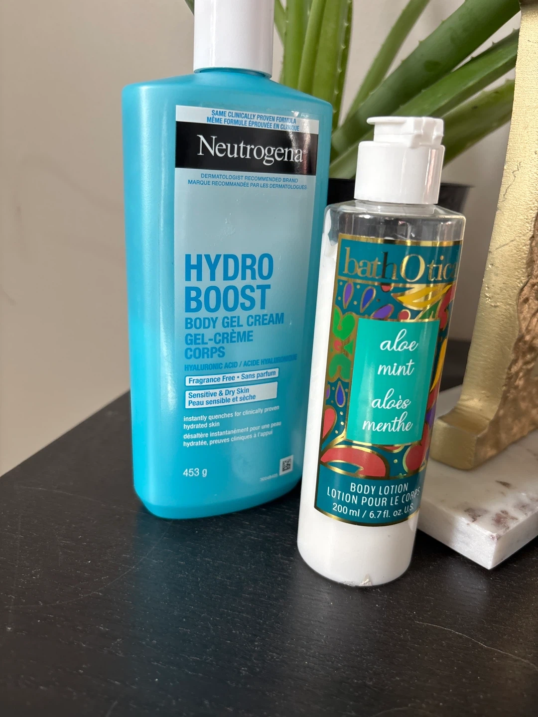 Neutrogena Hydro Boost Body Gel Cream 453g for sensitive & dry skin. Bath & Body Works Aloe Mint Body Lotion 200ml. Both are fragrance-free and designed for hydration. Available for pick up this evening or tomorrow evening first come first serve