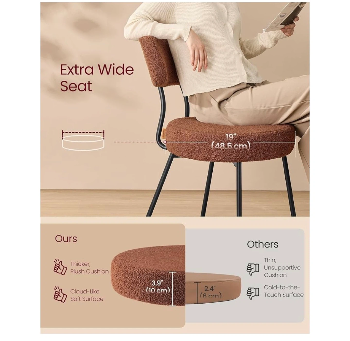 This chair features a premium teddy fleece upholstery for next-level softness. It has an extra-wide seat with a thick, plush cushion measuring 19" (48.5 cm) in diameter and 3.9" (10 cm) thick. The sturdy metal frame supports up to 265 lb (120 kg).