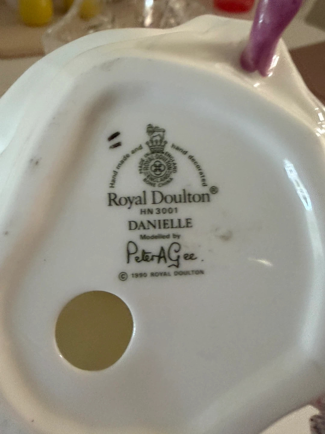 This is a Royal Doulton DANIELLE HN3001 figurine, modelled by Peter AG ee. It was made and hand-decorated in England in 1990. This porcelain figurine depicts a woman in a flowing gown.
