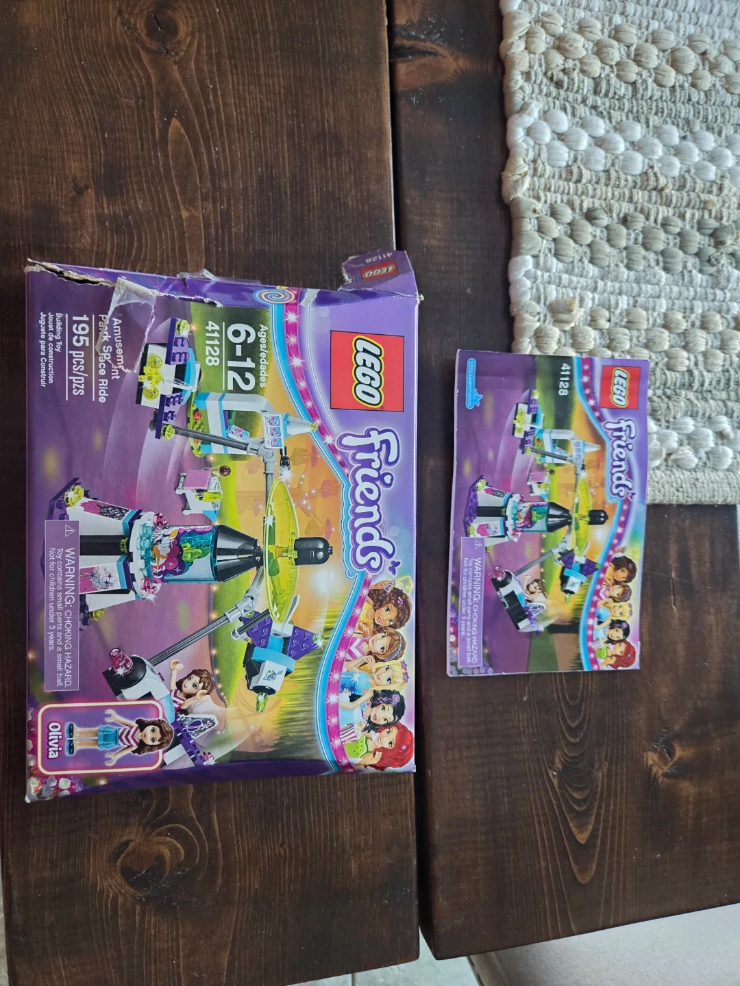 This is the LEGO Friends Amusement Park Space Ride set, model 41128. It includes 195 pieces and is recommended for ages 6-12. It's a fun building toy for kids! It comes with the instruction booklet.