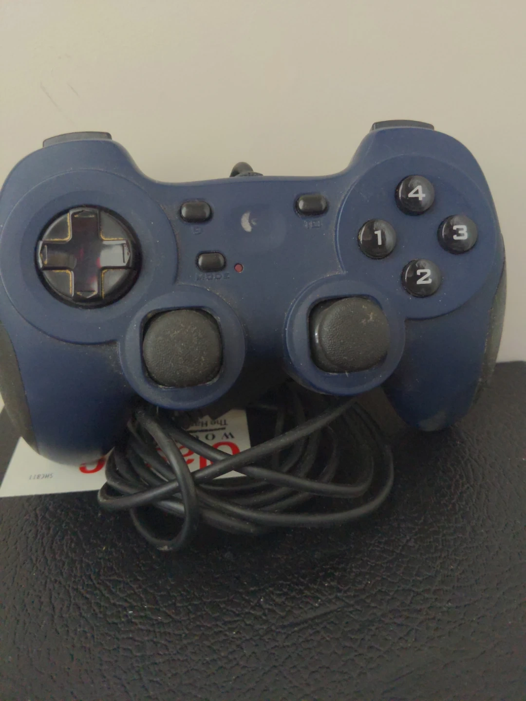 A blue wired game controller. It has a D-pad, analog sticks, and face buttons numbered 1-4. Connects via USB.