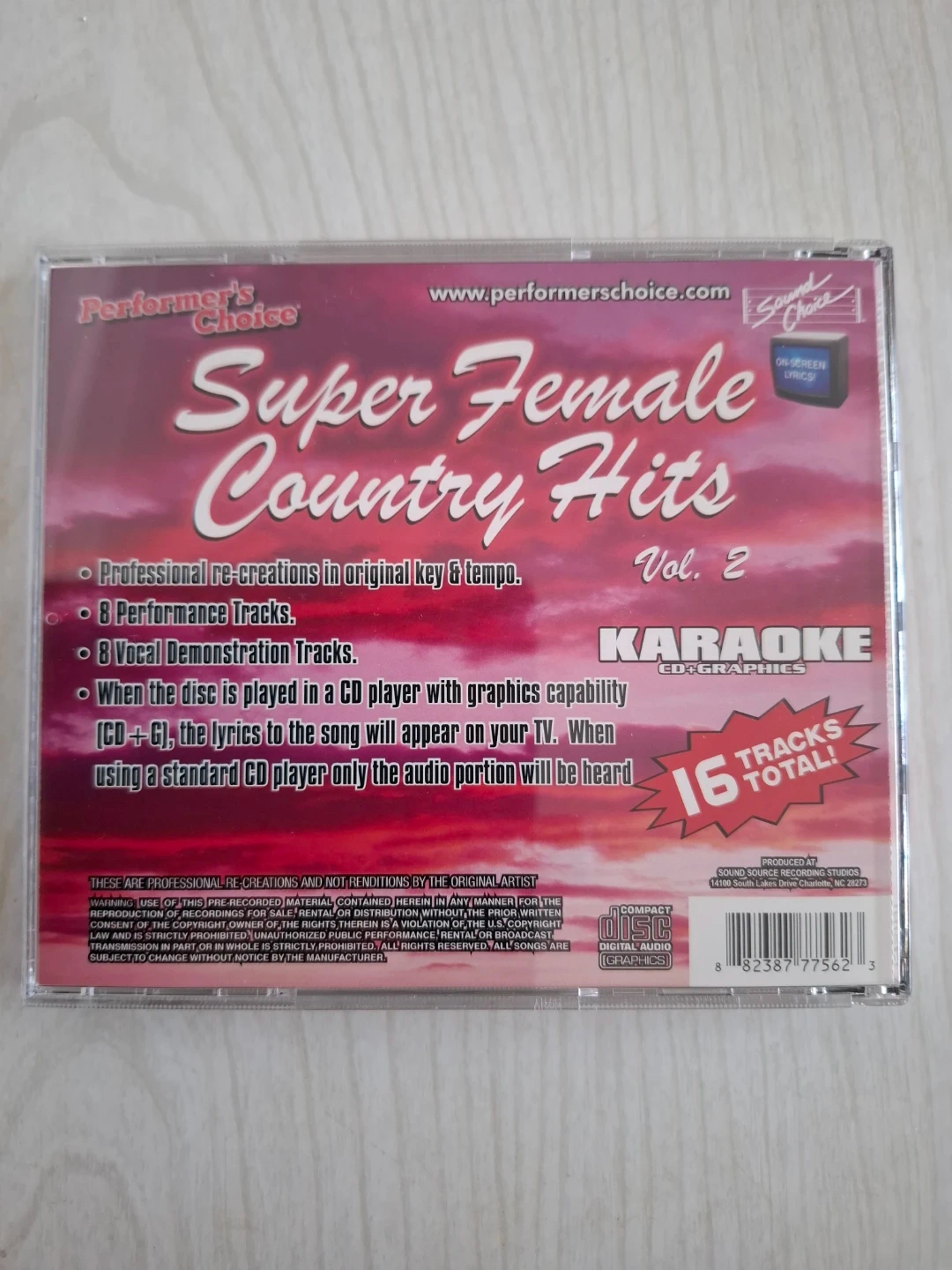 This is a karaoke CD+Graphics disc featuring "Super Female Country Hits Vol. 2". It includes 8 performance tracks and 8 vocal demonstration tracks. When played on a CD player with graphics capability, the lyrics will display on the TV.