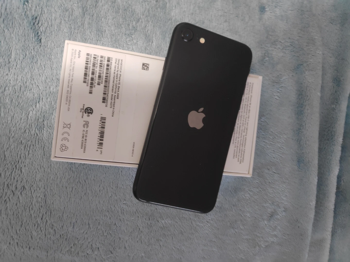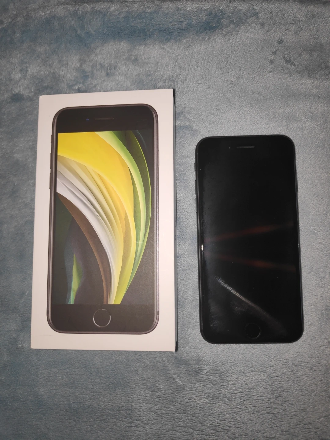 Apple iPhone SE (2nd generation) in black. It comes with the original box. This phone's compact size makes it easy to handle.