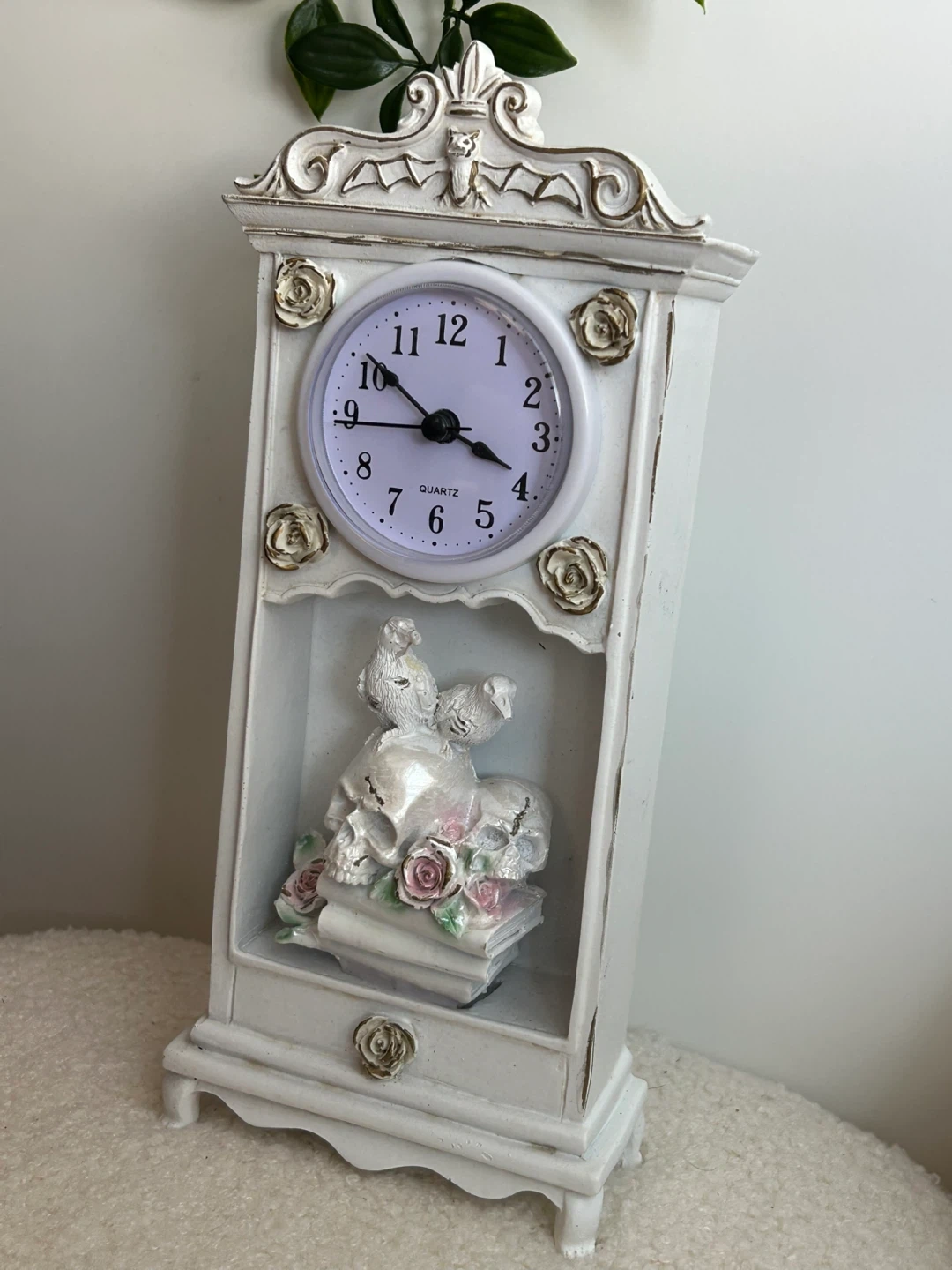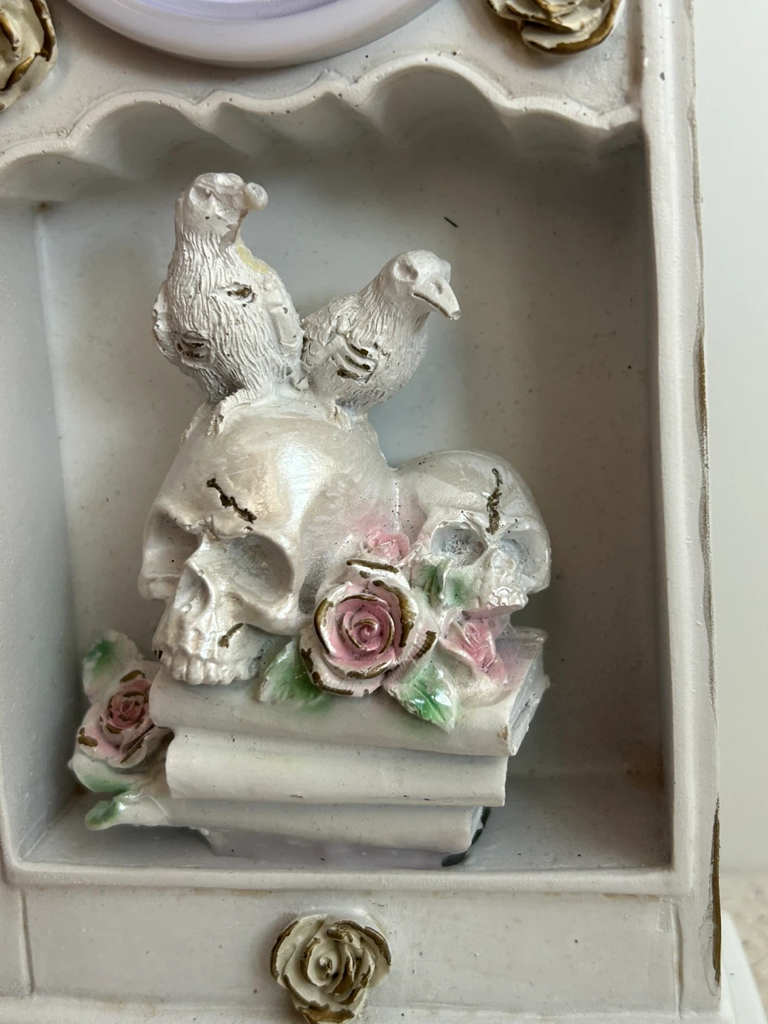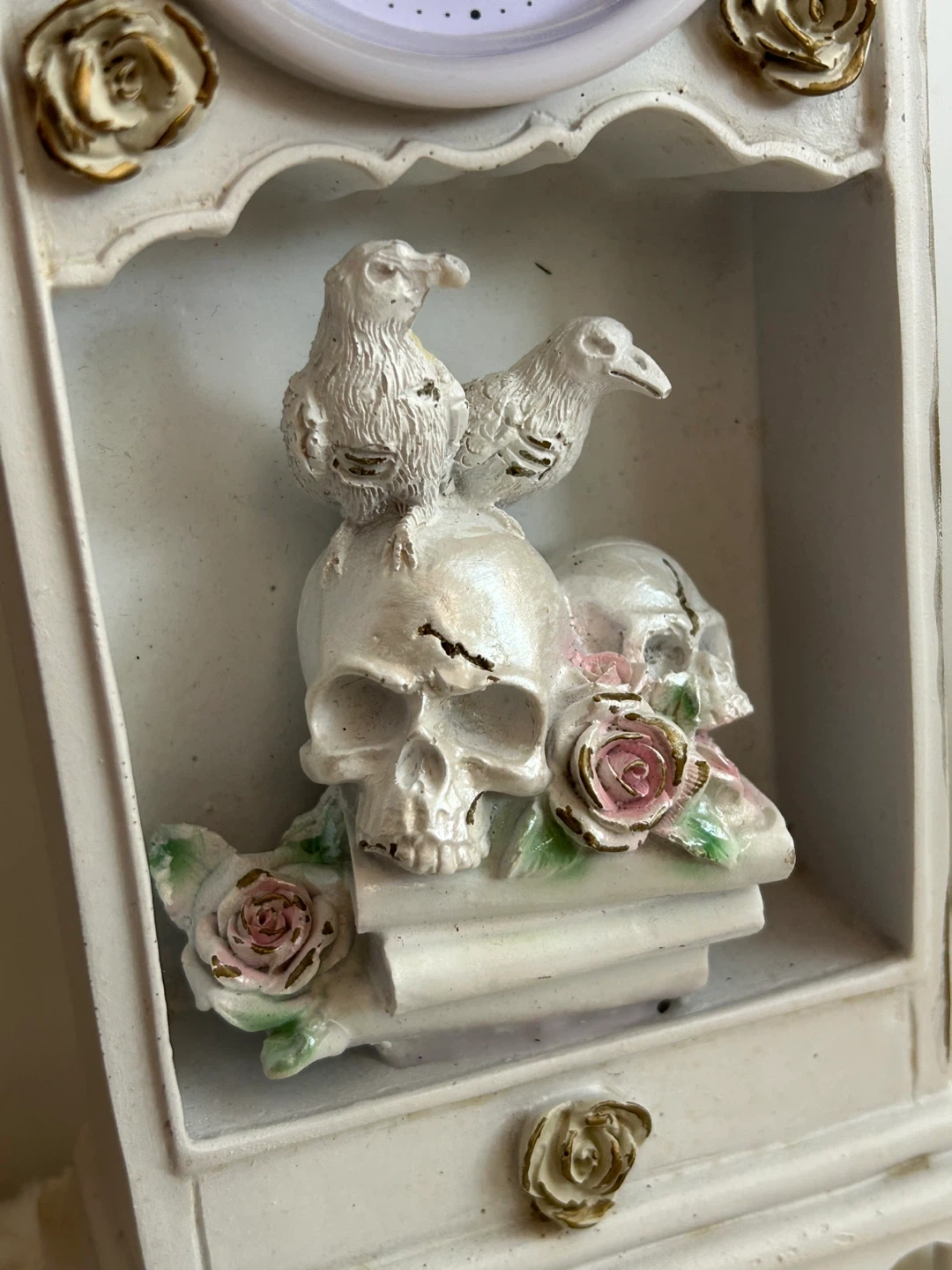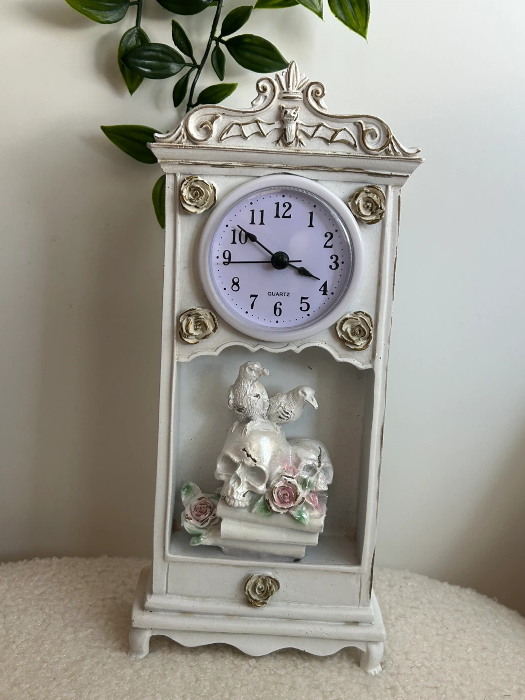 This decorative mantel clock features an ornate white finish with gold rose accents. It has a quartz movement and a whimsical gothic-inspired design with a skull and birds vignette. Requires one AA battery (not included).