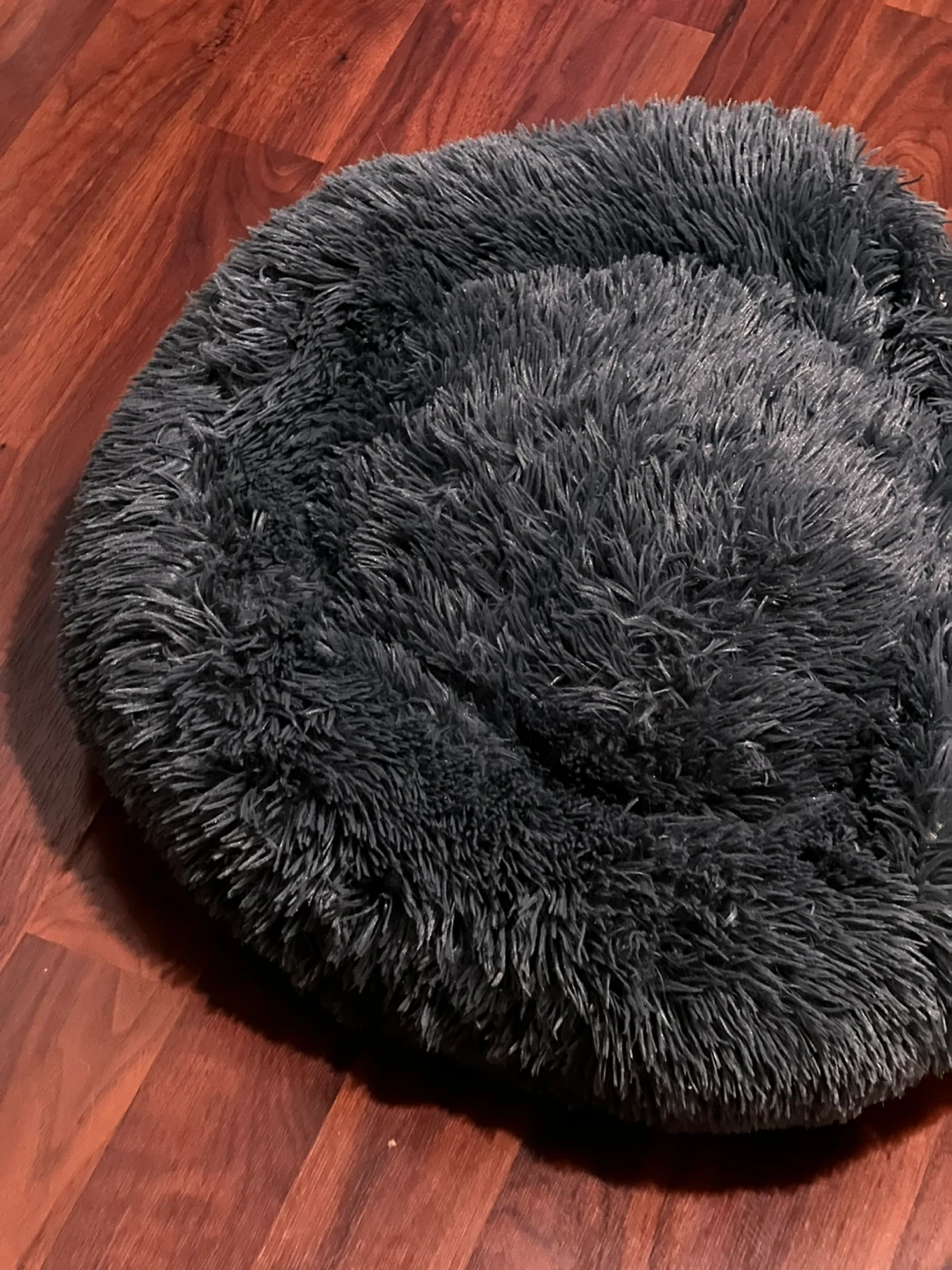 This plush pet bed is super soft and comfy. It's a round, dark grey colour and looks very cosy. It's a nice size for a cat or small dog to curl up in.